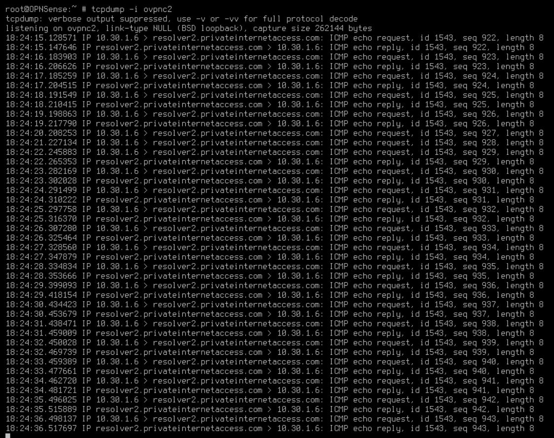 New 19.1.5_1 Update: TCPDump... it looks like the connection is working now in 19.1.5, but there is another issue present. The OpenVPN Client connection keeps reloading every 10-15 seconds. You can see by the IP address changing for the source in the TCPDump. Now I just need to get it stable and to stay connected. OpenVPN Client Log: