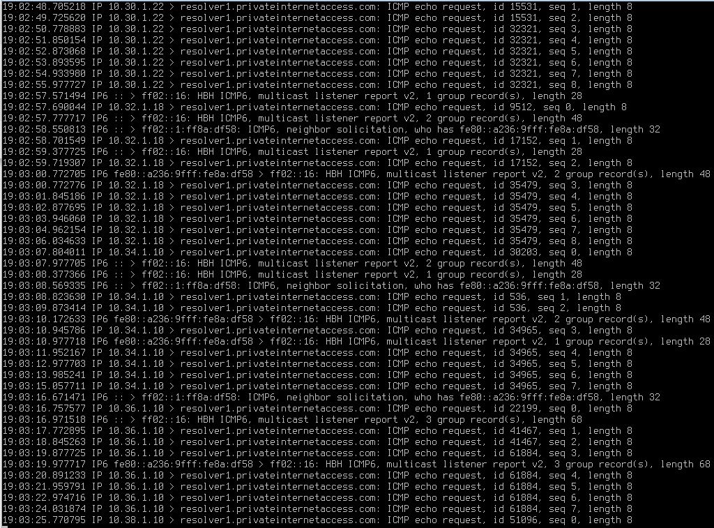 I messed with these outbound nat rules quite a bit during troubleshooting... it is longer that I normally would have it. I took a comparison of routing table on a 18.7.10 config vs 19.1.4: Then I did the TCPDump... I think I can kind of see what is happening. It looks like the firewall itself is trying to submit the pings on 19.1.4. Since the hostname of the firewall is shown on the dump. |