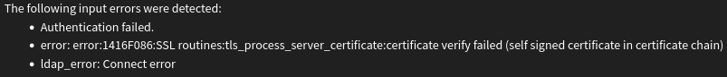 add CA certificate (used for the ldap server certificate) under Trust -> Certificates -> Authorities