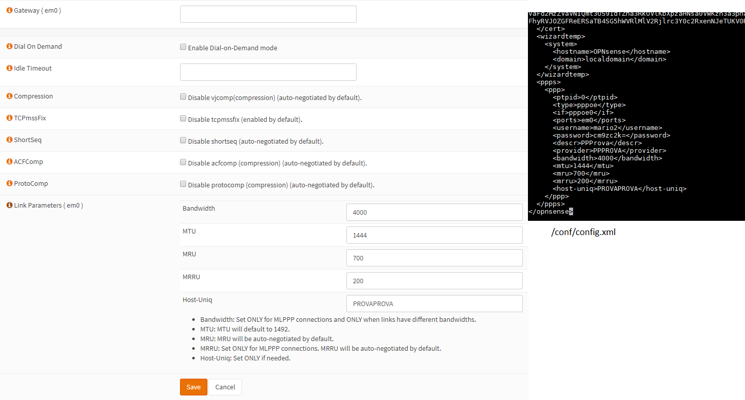 Ok, I tried now and after reading the documentation of ng_pppoe it works (now I'm connected with it). I don't know if you prefer using only the "Service Name" field on the webGUI or you prefer make a code that merges the two values in a single string. Thank you 👍 I think all the people in Italy that wanted to get rid of the VodafoneStation router will be pleased. |