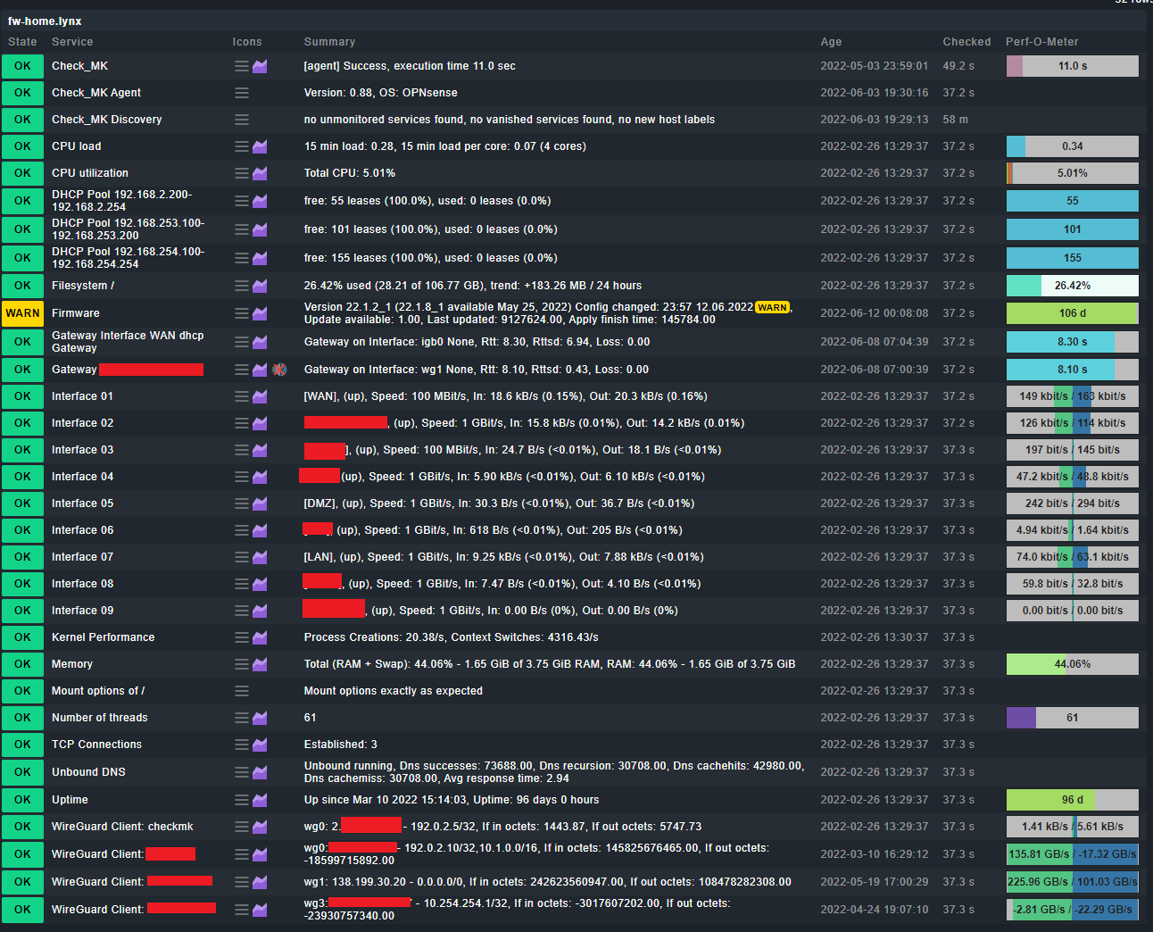 There's a third party checkmk agent, that ties better in to OPNsense, as it can report back more detailed information (Sceenshot) check_mk_agent is in FreeBSD ports, but I think we'll need some work on extending the checks it does, otherwise the checks will be very basic, compared to what the third party one can provide. It maybe we can chop up this third party script and add apart of the proper agent, as a plugin. This is turning in to a larger job though, but would be nice to have. |