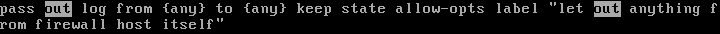 yes I do see that rule but something is wrong with it: When I dump packets on the OSPF interface like this: I get correctly looking hello packets: But on another host within the same segment nothing is coming in: When I disable the firewall with "pfctl -d" almost instantly the packets arrive on the peer hosts. For testing I installed a pfSense VM and configured quagga on it and I notice slightly different outgoing rules: So there is definitely something blocking the packets from leaving the VM. Any suggestions on how to debug this further? |