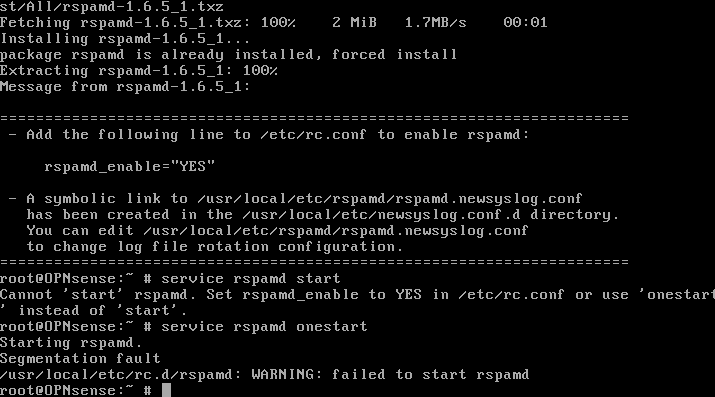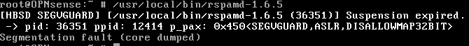So, what I'm going to do is: In OPNsense: hardening.pax.disallow_map32bit.status will default to 1 (application must opt in). Advanced users who also don't need rspamd can set it to 2 (application must opt out) via a tunable. In the meantime, you can work around this by setting the hardening.pax.disallow_map32bit.status tunable to 1 via /boot/loader.conf.local. For example, login via ssh and run the following command (as root): |