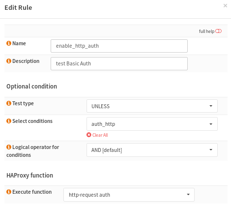 Guide: Enable HTTP Basic Auth in HAProxy1. Setup a ConditionHAProxy will match username/password from client against the specified list of users/groups: 2. Setup a RuleHAProxy will send auth request if client username/password does not match: 3. Add Rule to Public Service (or Backend Pool)This will enable HTTP Basic Auth for a Public Service or Backend Pool: |