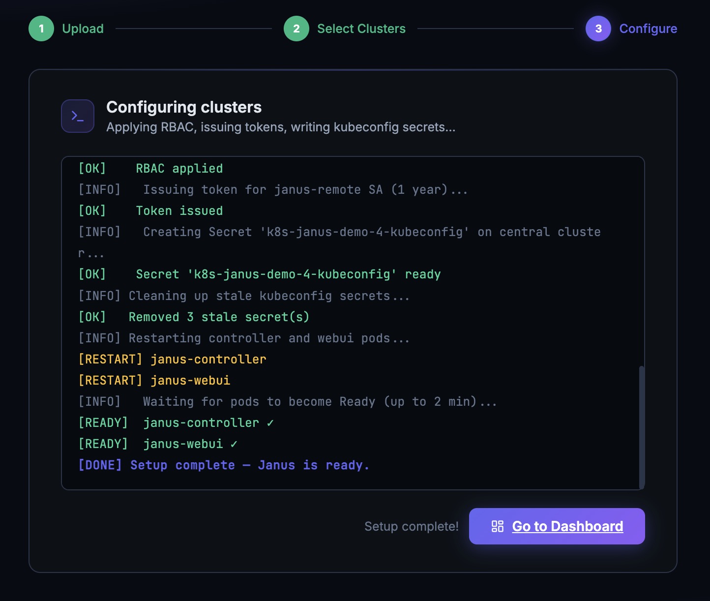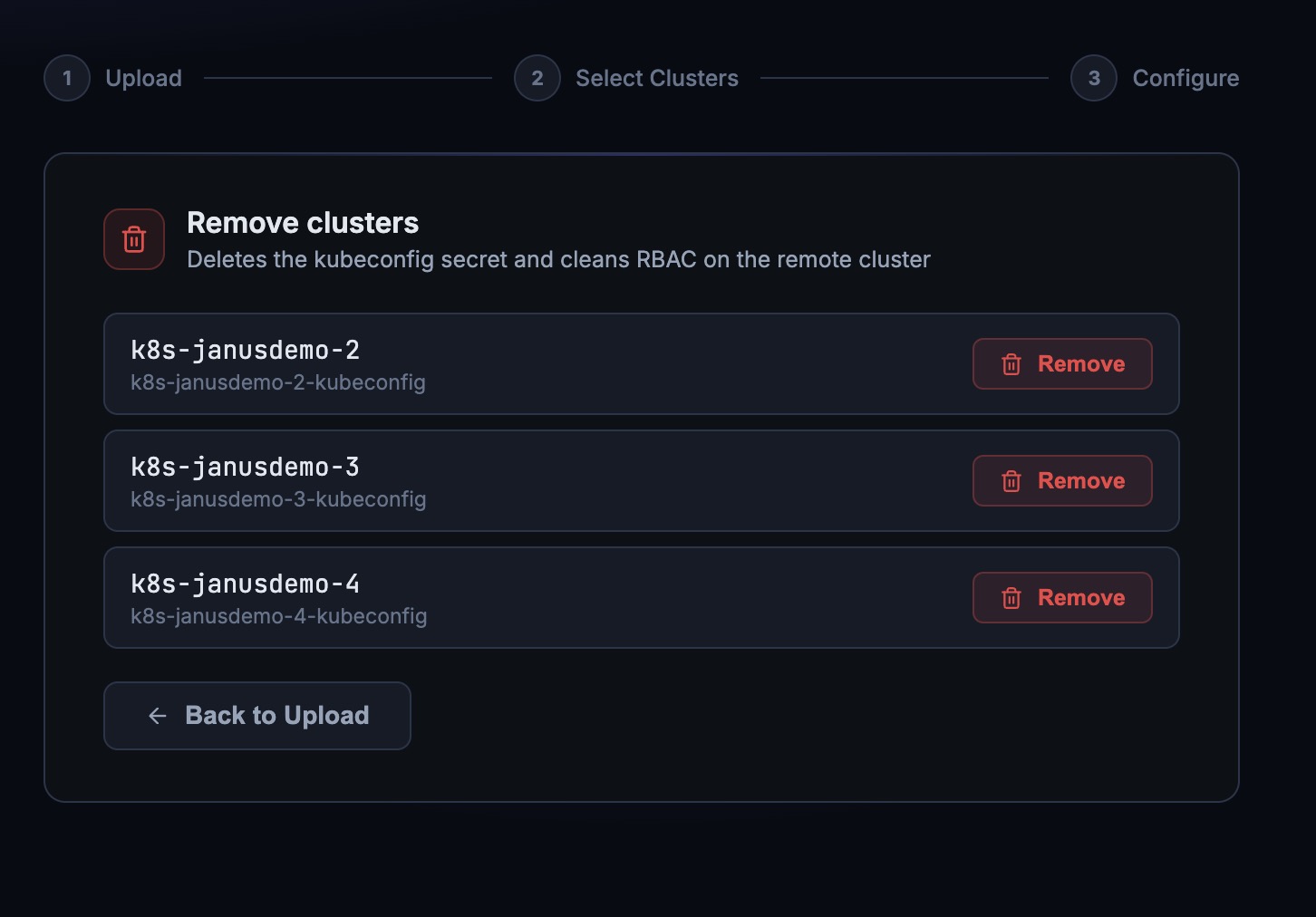 janus-remoteRBAC to each remote cluster - Issues a scoped 1-year token and creates the