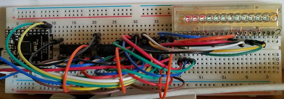 Posted at 2017-10-12 by @allObjects The display can be looked as a matrix of 8 columns (segments) and 12 row (digits) of (144) LEDs (with the columns of one row lit at a time / all rows displayed time multiplexed). The Anodes defining a columns of a matrix, and the cathodes are the row... Something like that is easy to drive with shift registers, as we see in other conversations, such as Driving LED matrix with shift registers such as 74HC595 and Is it possible to connect this 8x8 RGB matrix to espruino boards?. The project of this conversation was first, but got 'intercepted' by previous ones before being published. But now is the time, and it turned out even enhanced with the input from the other conversations. Here is the depiction of the display in character graphics Here is how the pins of the carrier board are mapped to the digits - the common cathodes c0..cB and anodes/segments _A .. _H: Segments A..H that have to lighten up by being driven high, and because all same segments are connected with each other, the common cathode for only one digit can be low at times. Therefore, the display has to be driven time multiplexed: one digit after the other has to be displayed in a fast manner, so that the human eye still perceives them as lit at all times... The previously mentioned conversations elaborate in more detail about why all digits are displayed - one right after the other in one 'shot' - in intervals of 10..20ms. Interesting is that a the bars of one digit are on just for the code execution time for prepping to light up the next one... the delay is not between the display of the digits, but between the lightening of all. Of course, this gives a lower duty cycle - and dimmer display - but proofs to be less susceptive to flickering when something else is going on and the interval cannot be honored in a timely manner (the whole display gets dimmer instead of one digit becoming brighter, which is choosing the lesser 'evil' / shortcoming). Below the coding of the digits: Having to drive 20 lines for 12 digits times 7 segments and decimal point being the 8, we need at least 3 74HC595: