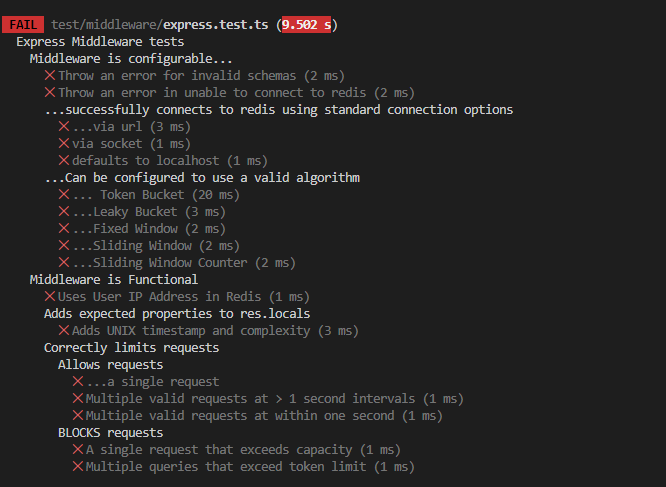 Writes tests for Token Bucket implementation of Express Rate Limiting Middleware.