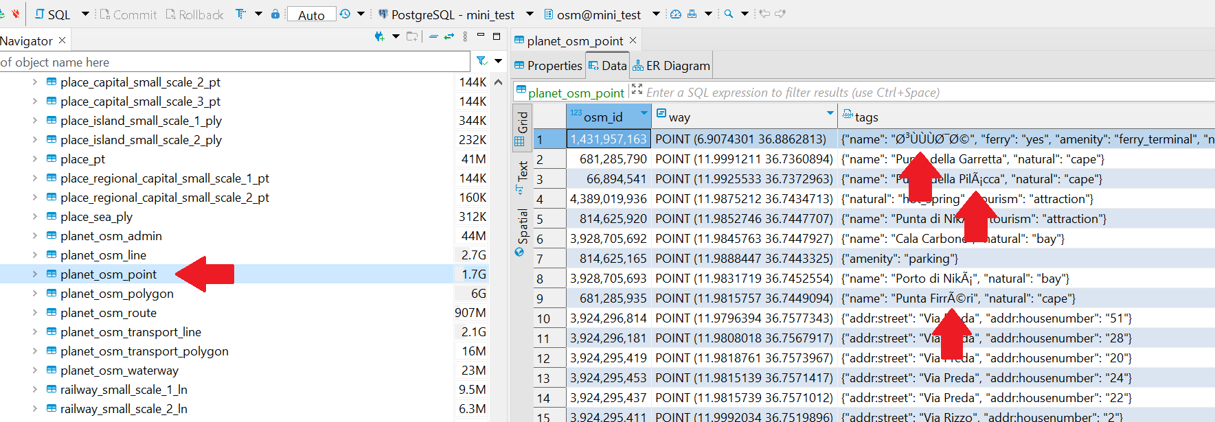 Data in the 'tags' field is garbled. Special characters do not come over properly, e.g. https://www.openstreetmap.org/node/3225272477#map=19/46.05451/9.43078
