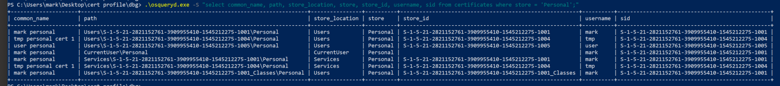 findUserPersonalCertsOnDiskfunction enabled and disabled (return immediately). RanMeasure-Command { .\osqueryd.exe -S "select * from certificates;" }20 times. My system has 3 local users with 1 Personal cert each.Disabled (average, ms): 1582