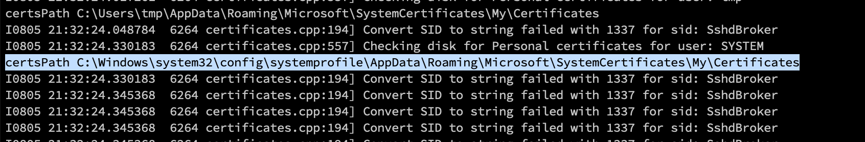 userandtmphave logged in; there are entries in theUsersstore location for other stores because their hives have been loaded, so the winapis find them. https://gist.github.com/mossberg/048d4fb04c75bdd9f1d66c27e549ded7For additional testing, I added a certificate into the Local System account's directory for Personal certificates. This exists inside