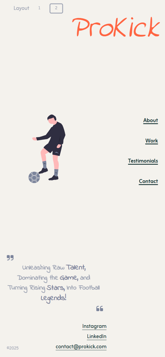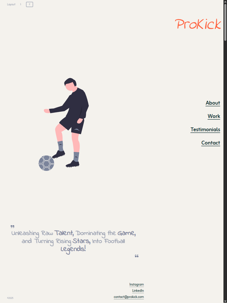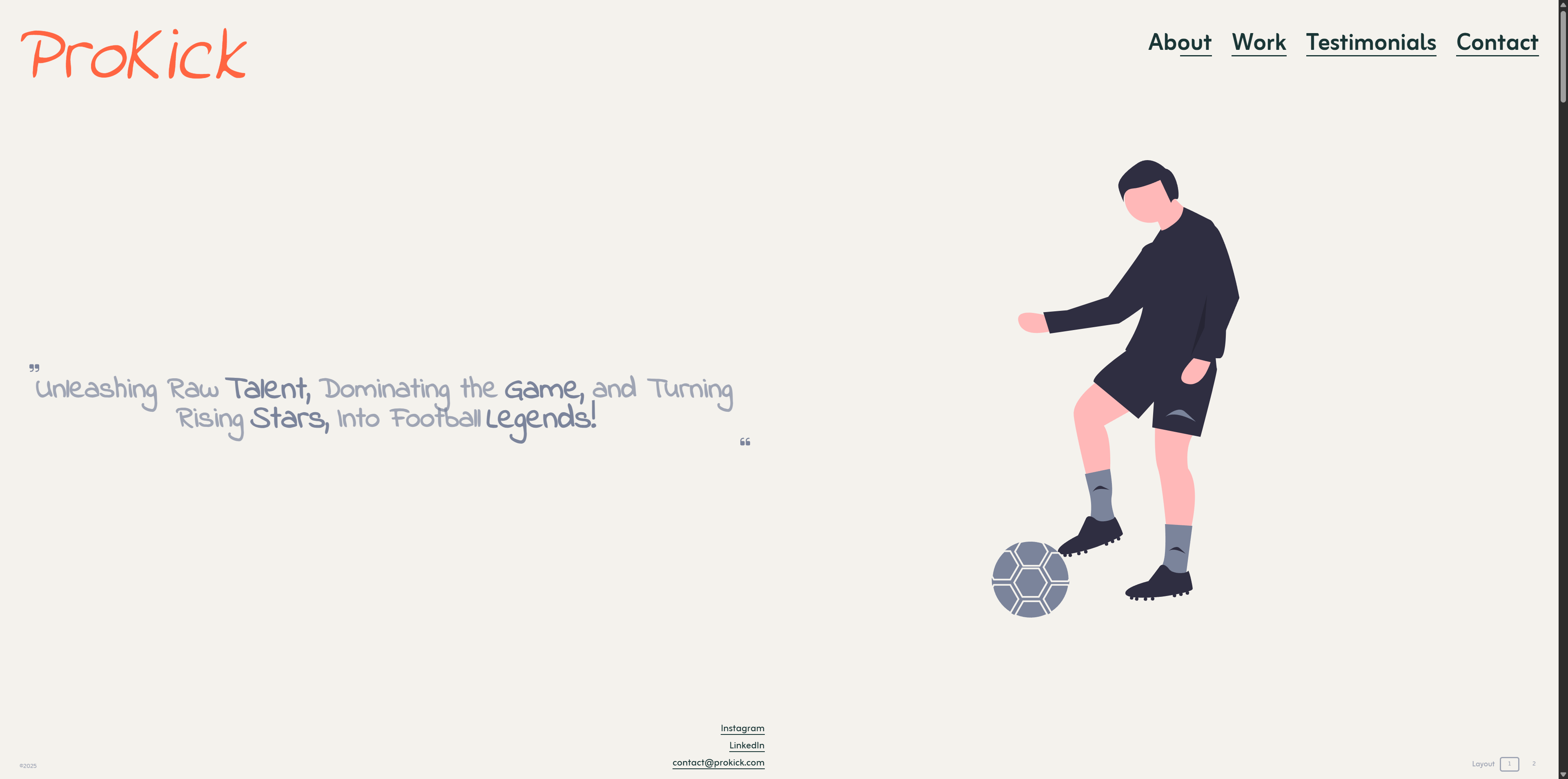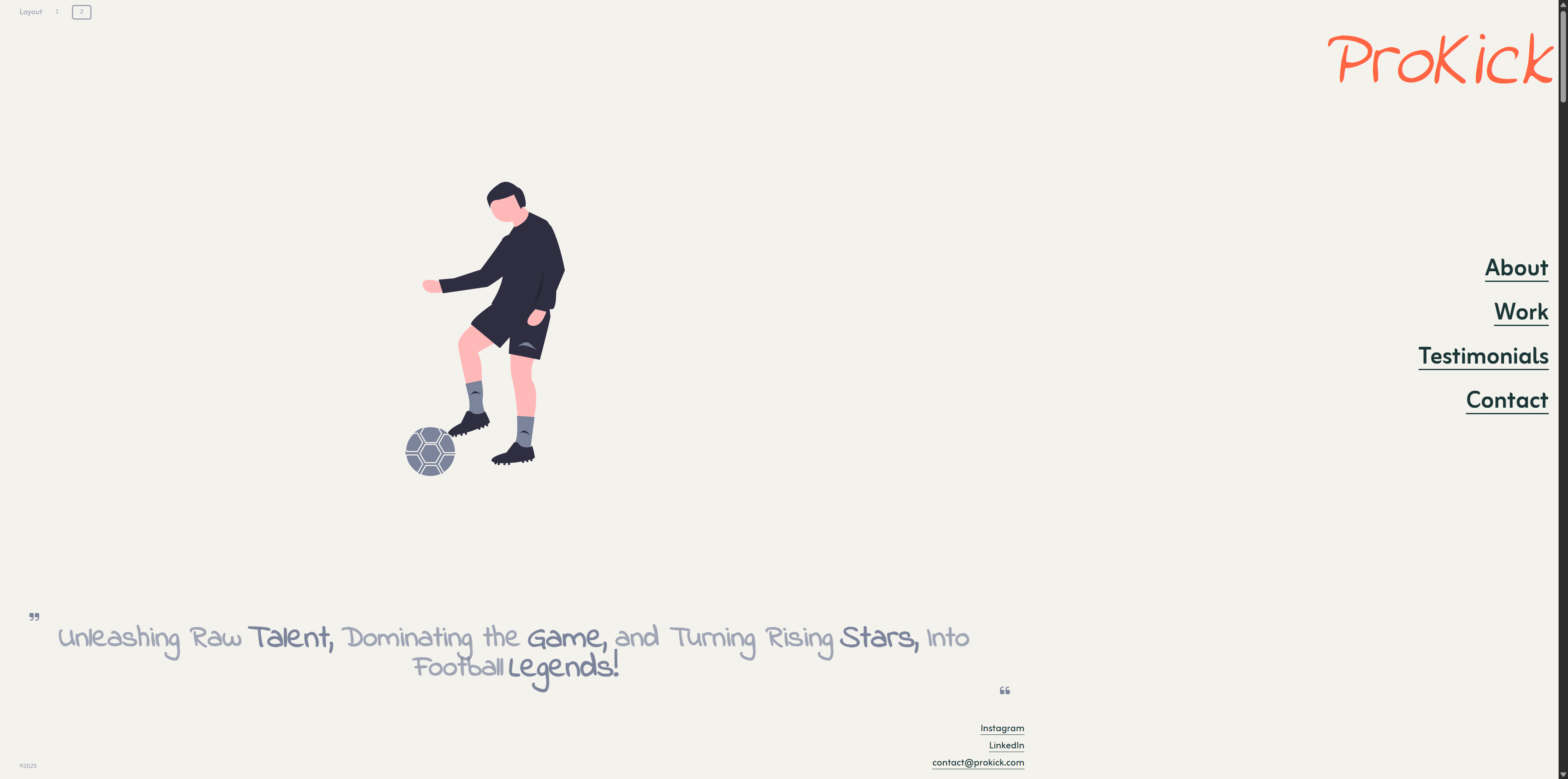 This sleek and responsive site highlights the Prokick team's mission, work process, testimonials from successful talents, and a contact section for potential recruits or partners.