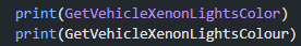 GetVehicleXenonLightsColour -> GetVehicleXenonLightsColor#10