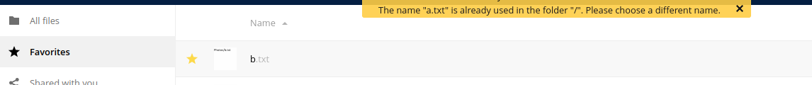 Seen in 10.9.0 beta1 * Create files a.txt and b.txt in folder Photos. * Mark b.txt as favorite, (but not a.txt) * Visit Favorites page, and try rename b.txt to a.txt, as expected an error message is shown. * The error message has the wrong folder:  no file a.txt exists in /, and if so, that would not be the cause of the collision. Expected behaviour: The name "a.txt" is already used in the folder "Photos". Please choose a different name.