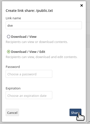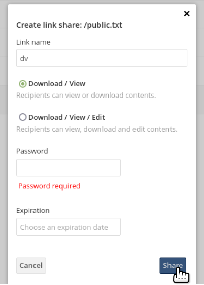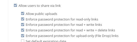 Seen with 10.12.0 (and also 10.11.0, not a regression) * Visit the admin UI -> sharing, and check all four available password enforcements.  ---- * Create a file public.txt and add a public share with read only permissions. * Try to leave the password field empty. An error occurs. OK  ---- * Create a file public.txt and add a public share with download edit permissions. * Leave the password field empty. The share is created. BAD. * Access the share through the public link, the file can be downloaded. BAD.  (Public links on folders work fine. Each of the four link types has its own enforce setting.)
