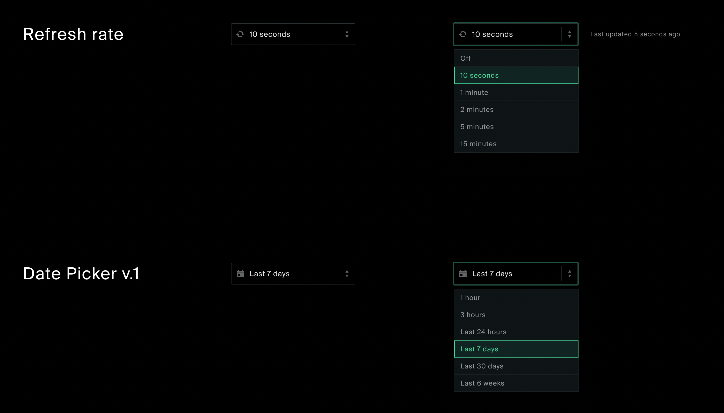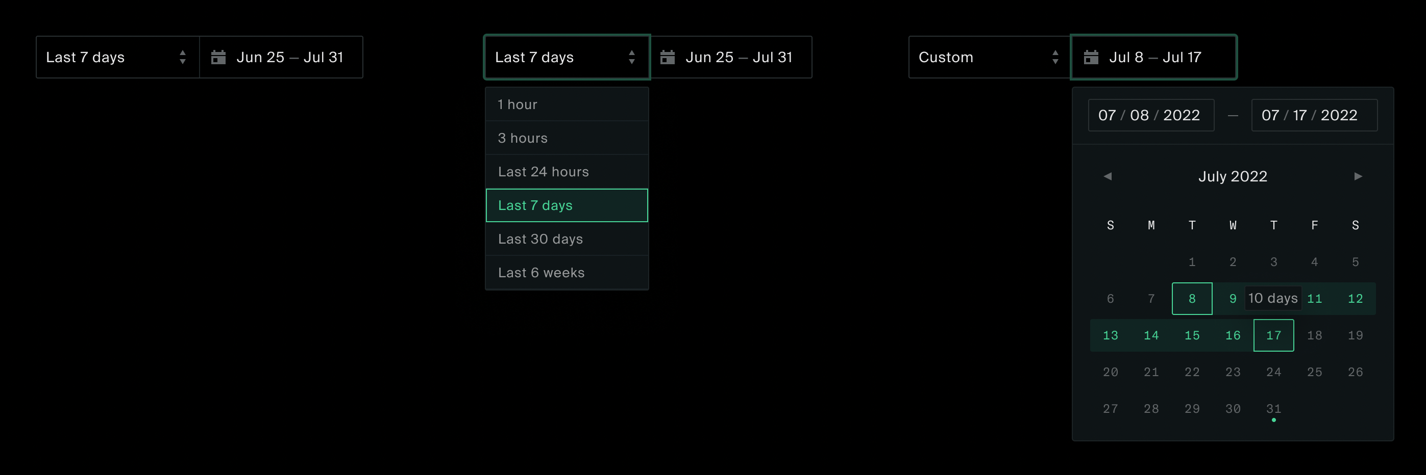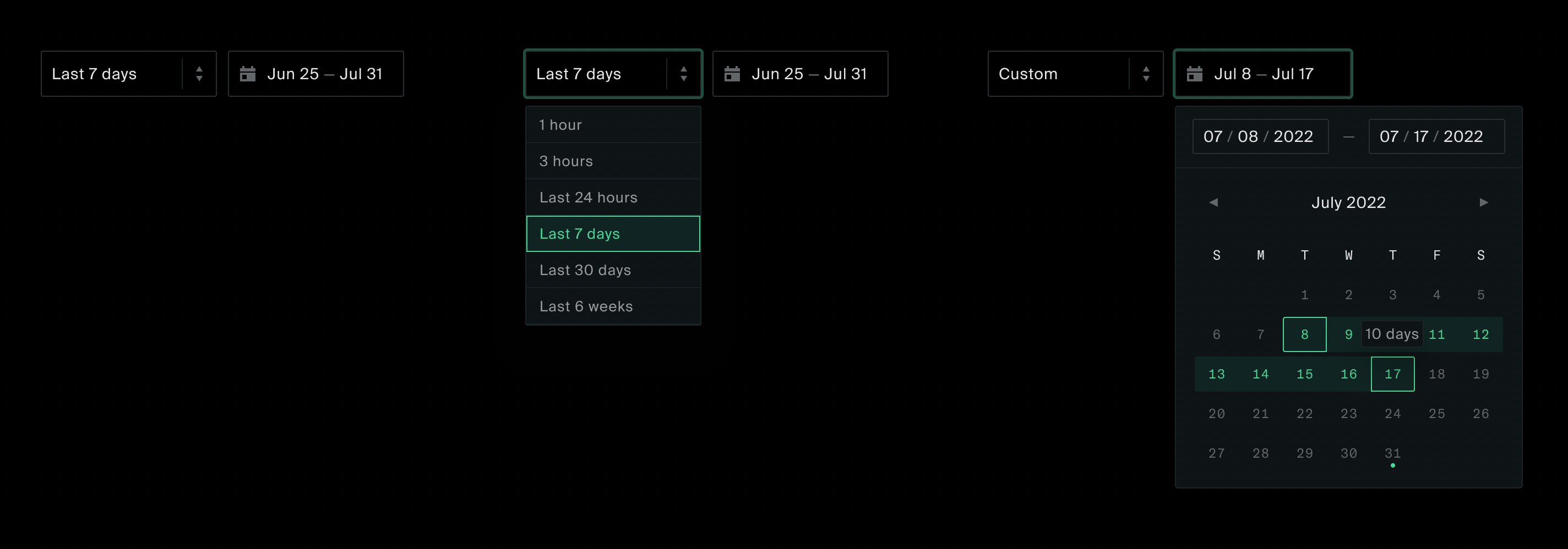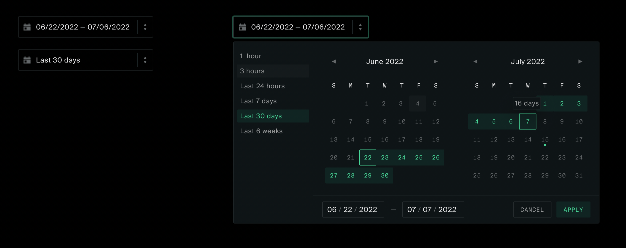 We need a component for an easy date range selection, mostly applicable for Metrics and similar patterns. As a quick win, before implementing a fully featured date picker, we can go with a simplified version.