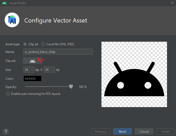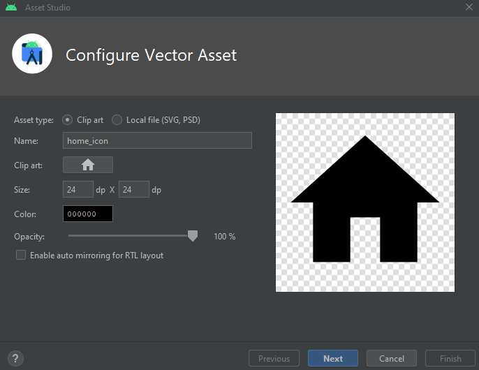 Uygulama logosunu figmada oluşturup svg ve png formatlarında indirdim. svg formatında olanı bikgisayarda manuel olarak proje dosyasına ekledim. png olanı ise android studio'dan drawable kalsörüne ekledim. Sonrasında drawable klasörü içinde bir vector asset oluşturarak svg formatındaki logonun xml dosyasını elde ettim: