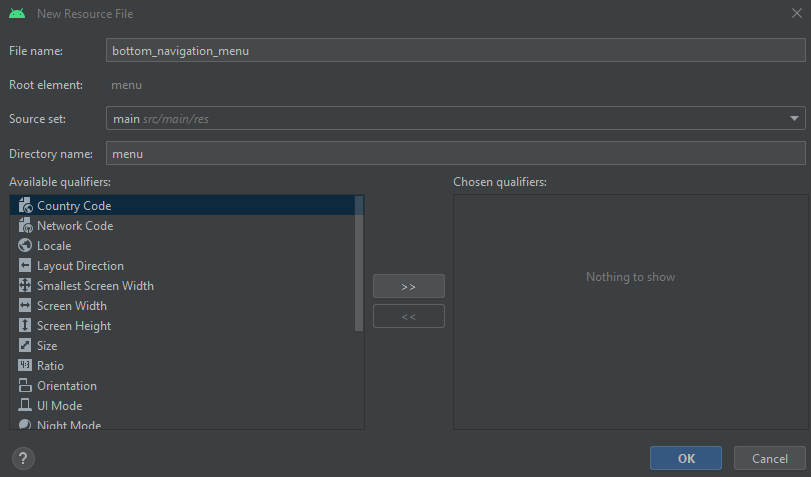 Şimdi menu klasöründe bir menu resource file açalım ve ismini goals_menu.xml koyalım: