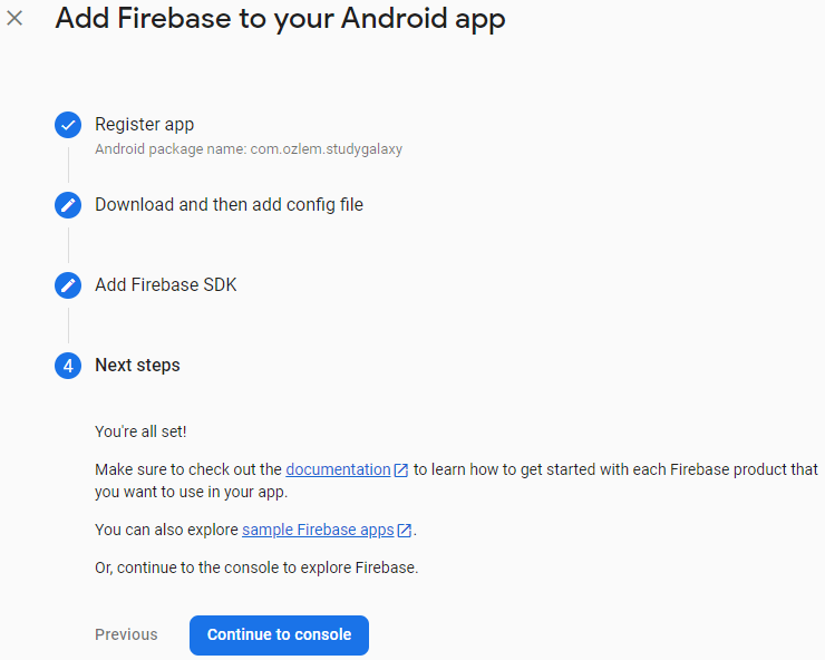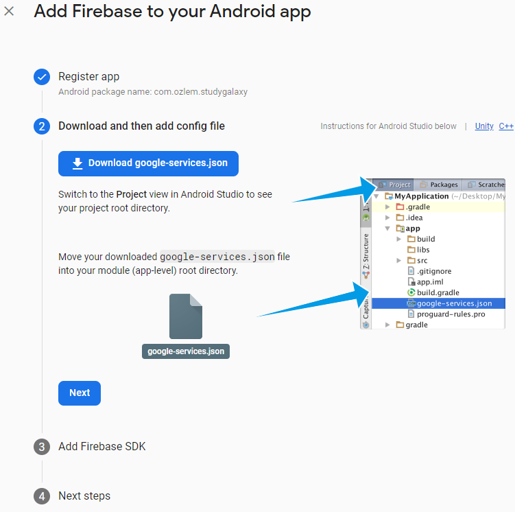 İkinci adımda bizim için bir dosya oluşturuluyor. Bu dosya bizim android projemiz ile firebase sunucusunu birbirine bağlayan dosya ve bu dosya olmadan hiçbir işlem yapamıyoruz. Bu yüzden bu dosyayı indiriyorum: