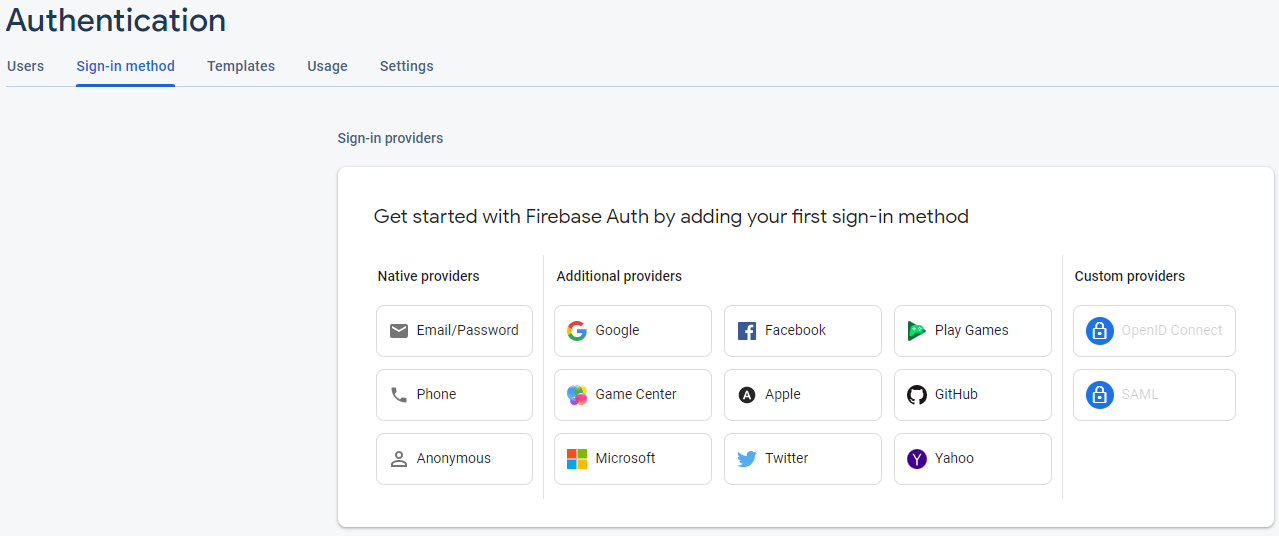 Buradaki “Get started” butonu ile authentication yani kullanıcı işlemlerini başlatalım. Get started butonuna basınca şöyle bir ekranla karşılaşıyoruz: