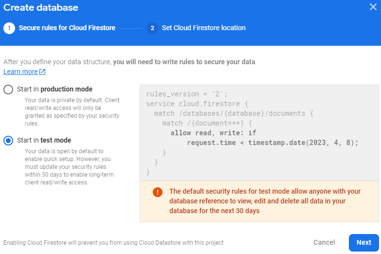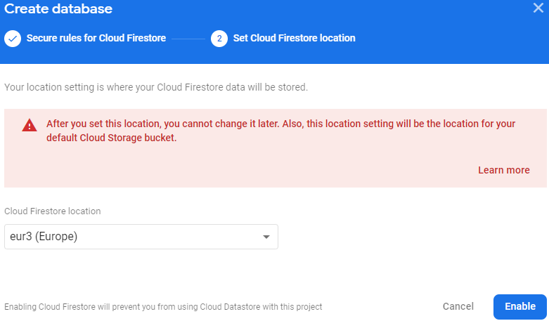 eur3 seçeneğini seçip Enable butonuna bastım. Bu işlemi sadece bir kez yapıyoruz bir daha karşımıza gelmeyecek. Şu anda bizim için firestore veritabanı oluşturuluyor.