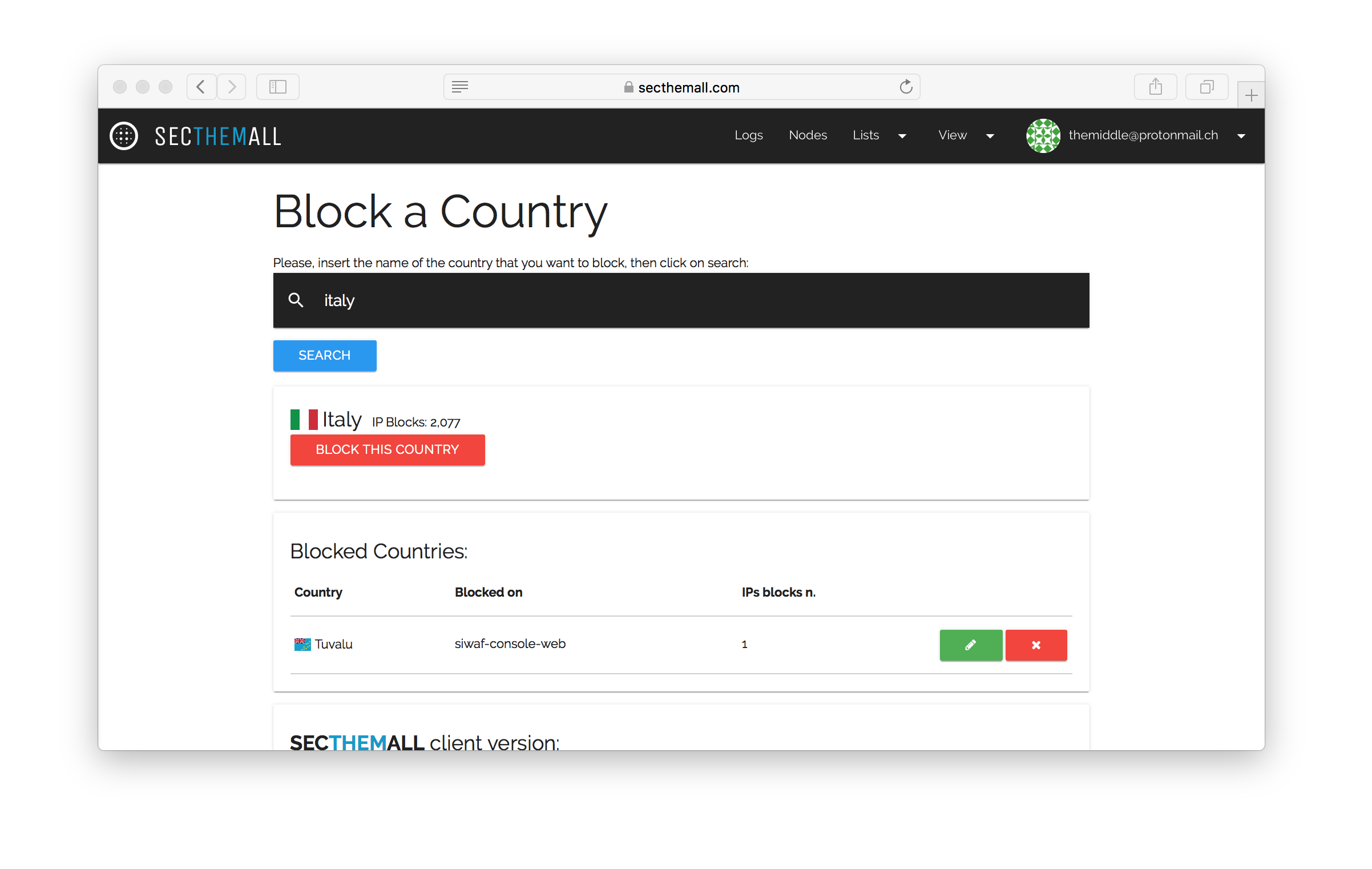 From the SECTHEMALL dashboard, you can block traffic coming from a specific country, on all your applications, with just a click! Log in to your dashboard and visit the countries page. The updatebl.php client will sync the country-blacklist on all configured applications.