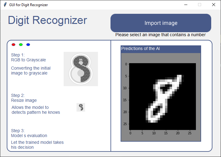 The application is used to predict single number from an image selected by the user, and it shows brievly how the image is pre processed.