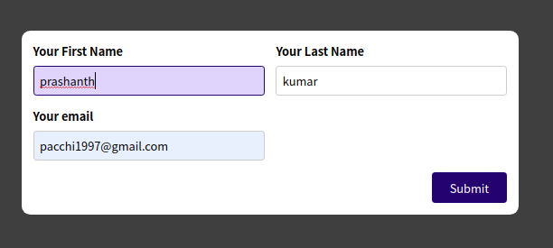 React-Simple-Form A react form to check user input, give validation feedback, handling complex form, managing was touched state and total form validation. Screenshots Download zip file or Copy below link and run in terminal git clone https://github.com/pacchi1997/React-Simple-Form.git Install Node Modules npm install Run the Code npm start Kudos!! You successfully hosted Expense Calculator in localhost:3000