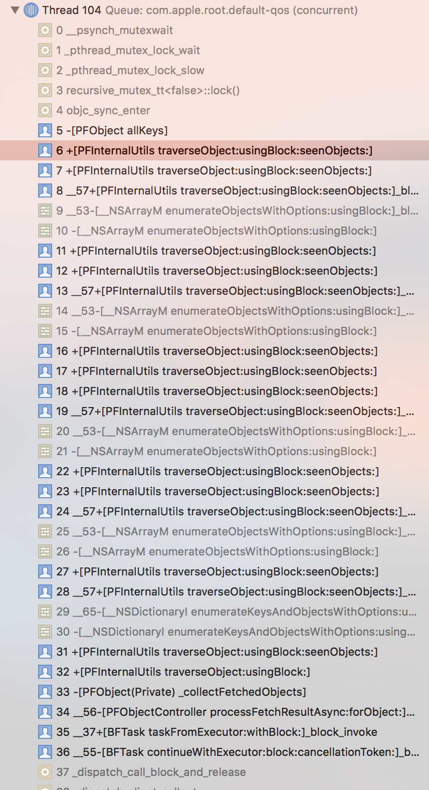 _collectFetchedObjects does a @synchronized (lock) on its object, traverses its connected objects, and when calling allKeys on another object, allKeys locks that object @synchronized (lock). Thus if A locks itself and then locks B, and then B locks itself and then locks A, we get a deadlock. This is confirmed when I look at the stack traces, in a lot of threads, they are waiting on a mutex from allKeys.