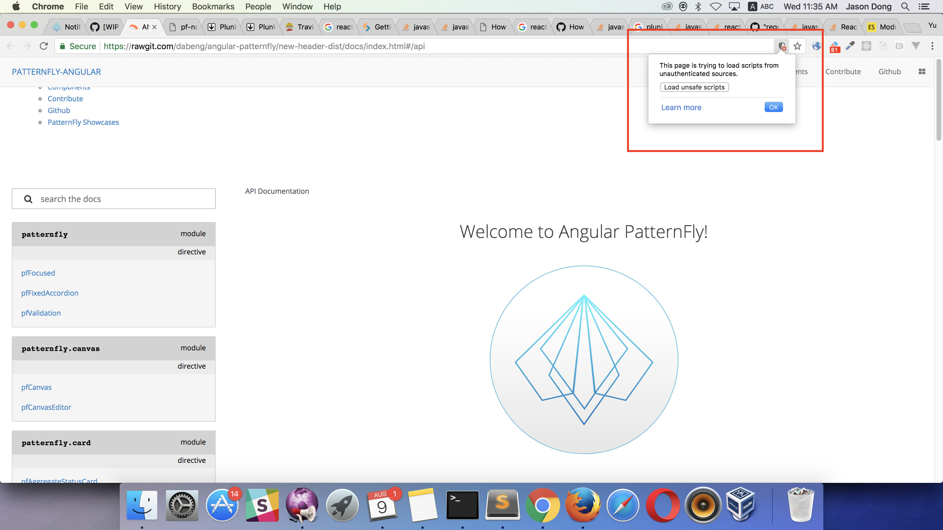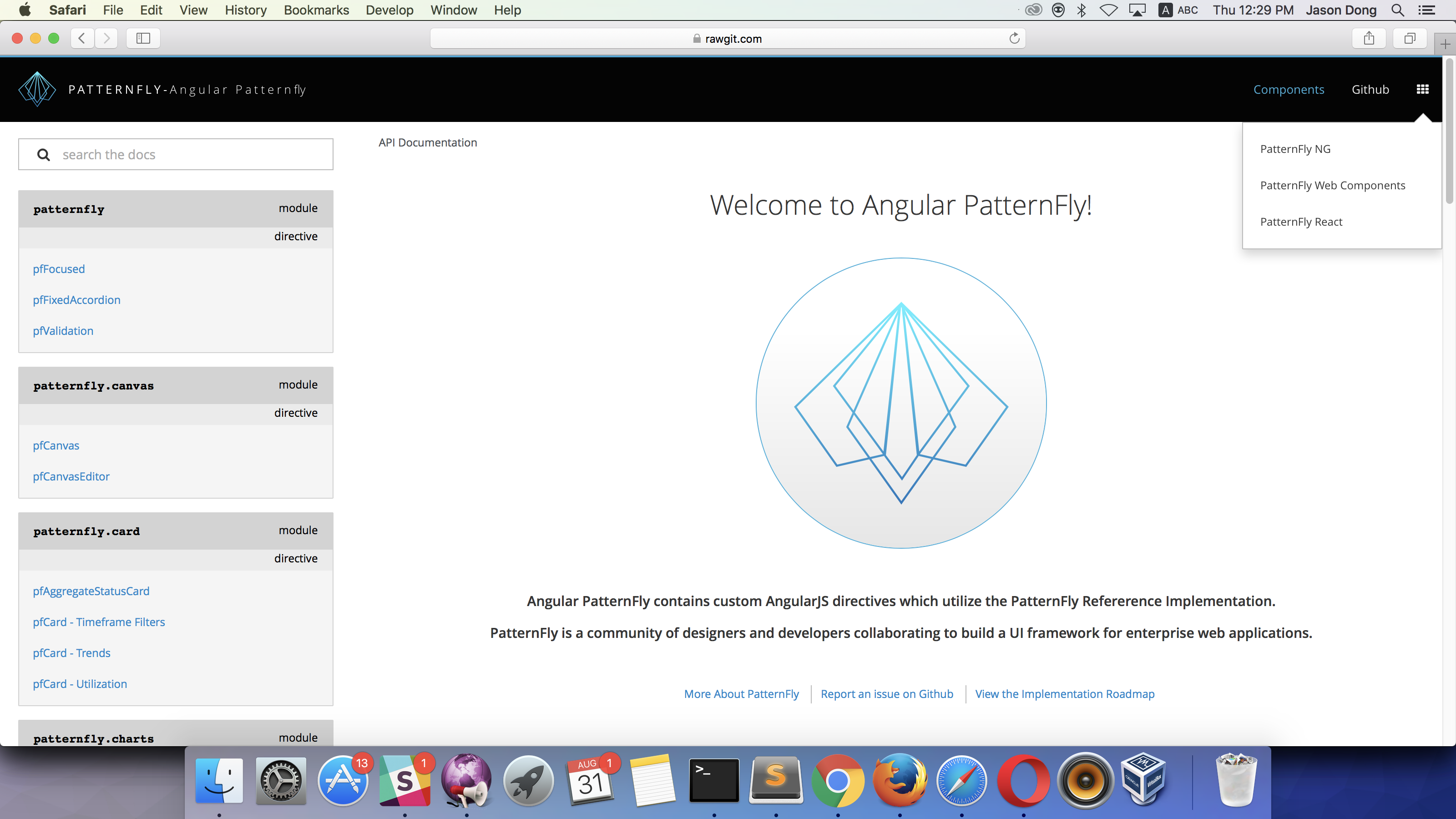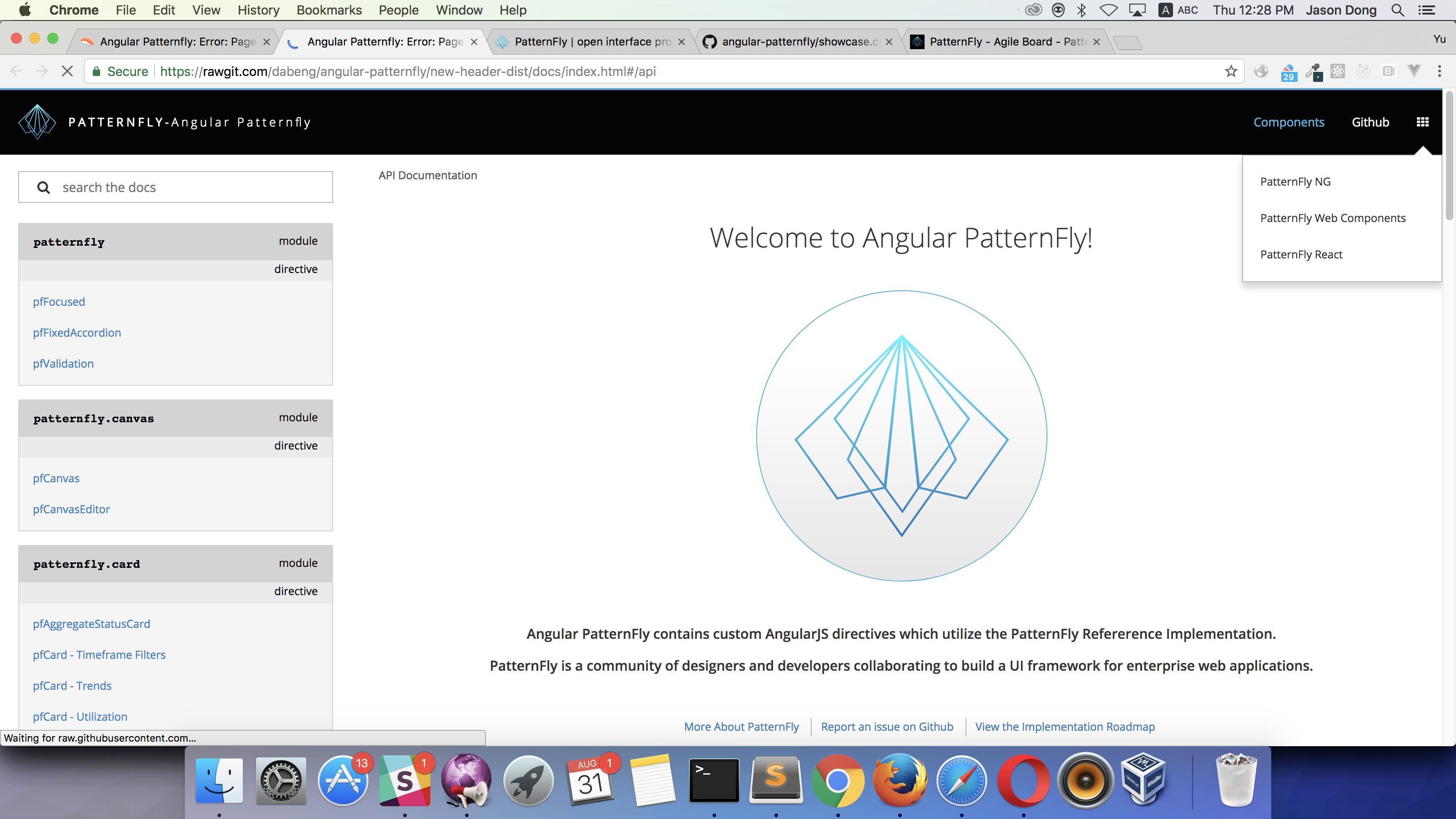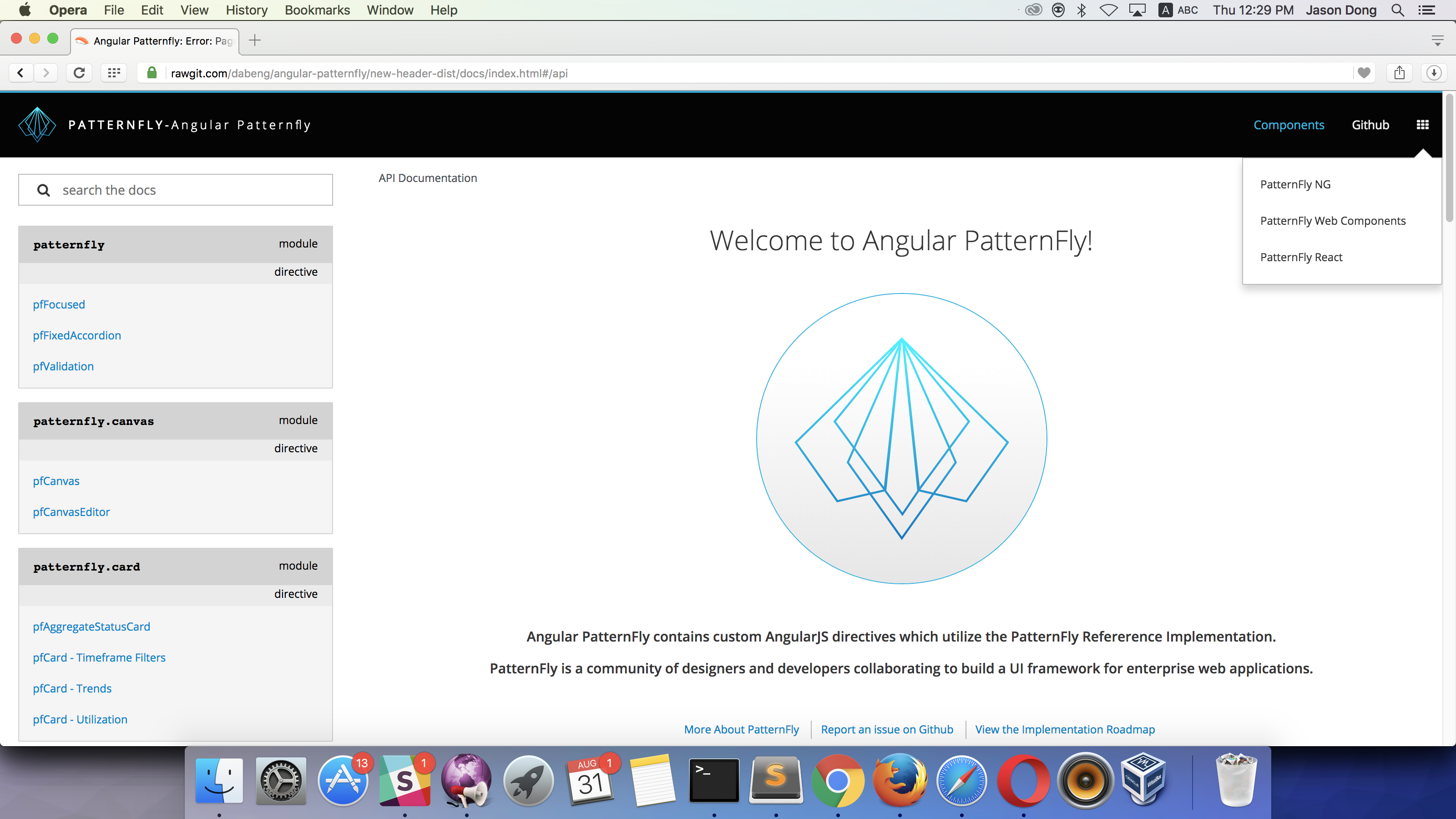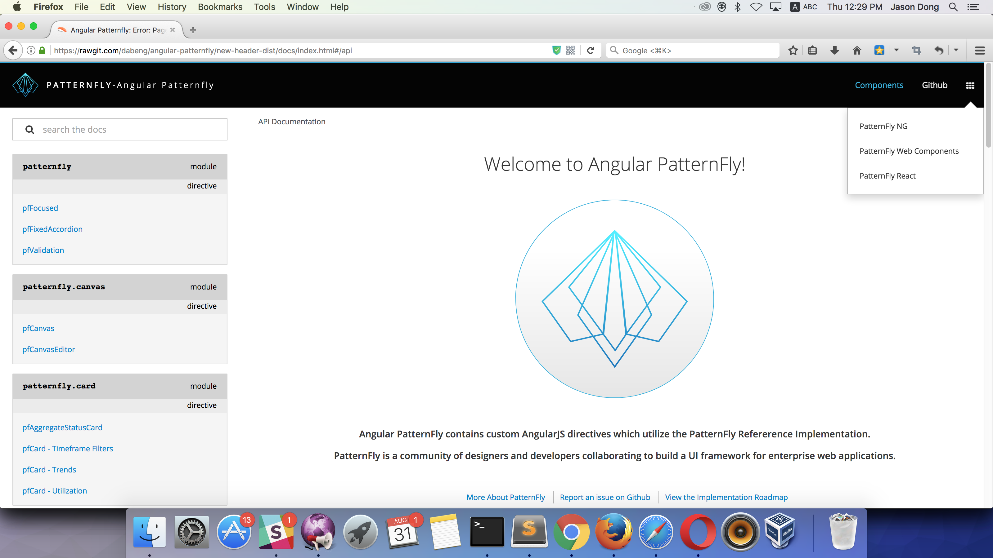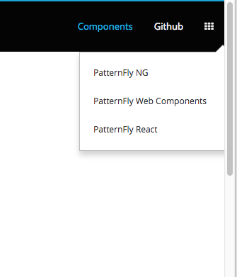 You would just use the patternfly version, not necessarily the Angular directive. I'm not sure you could get our directives to work at this point in the ng-docs template. You could try if you like by adding a file in the misc directory as a controller for the navbar and put those settings in there (including this new js file in the 'scripts' portion of the ngdocs settings in the Gruntfile). Then setting the controller for the nav and using the directive. It would be interesting to get this working as it could lead to further changes to the page and more that we could control. Changing to the simple Patternfly version of the application launcher is probably plenty though as there isn't much need here for any additional logic in the controller. However, there may be some adjustments necessary as I'm not sure how well the application launcher will work outside of a PF horizontal or vertical nav bar. It should so you may need to file some issues and do some workarounds until it is fixed. This is a good test for its adaptability 😉 |