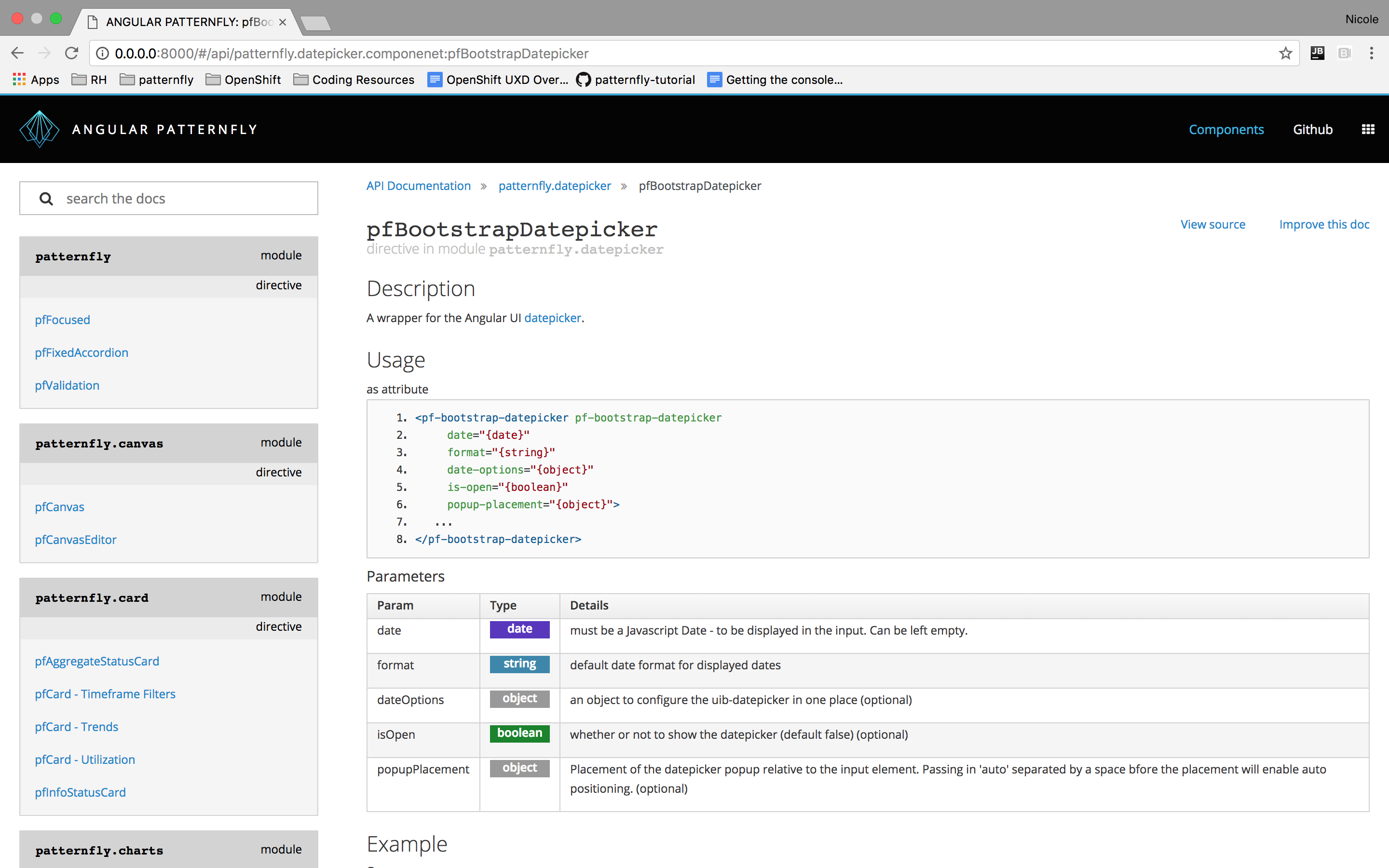Then in the browser, source tab, open up angular-patternfly.js, find the component, set breakpoints in $onInit() and $onChanges(). You may want to remove the first datepicker example, just to see how the lifecycle of one example works. You'll see that $onChanges() is called first with the objects from the example, then $onInit() is called afterwards -in this case overriding the $scope.dateOptions set by the user/example.