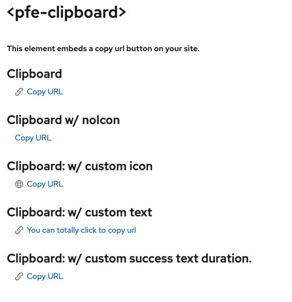 * feat: added pfe-clipboard element, adding slots and some styling * add an extend for host selector * add a11y attributes to treat pfe-clipboard as button * initial copy to clipboard function * added new Clipboard API with fallbacks * added demos * added icon-hidden boolean * add height auto to better account for other icons * added title to demo * adding pfe-toast as default notification option. * added template override to pfe-toast. * removed dynamic imports for now. Added template fallbacks for notifications * added notification text to slot schema * added demos * removed dynamic imports for now. Added template fallbacks for notifications * chore: added todo * added demo for custom icon, fixed icon variables * taking a stab at adding background vars * make default text into the default slot * added keyboard event listeners * move button to internal container * converted copyURLToClipboard to promise based * update docs * fixing svg widths in safari * added position fixed for toast * ie11 hacks to behave like a button. * added lighter weight font * added space to button input for a11y * chore: remove log * added a copied text slot and new state * fixed the hover and focused states to have outline instead of background * changed padding to 6 x 16px to match styleguide * adding aria alert based on https://www.w3.org/TR/wai-aria-practices-1.1/examples/alert/alert.html * corrected ie11 issues with styling slots * updated demo to not emphasis notifications * feat: remove notifications 🔪 * chore: comments and removing toast in scss * initial tests * check for slot content * added check for hidden-icon * bump version * combined h2 styles in demo https://github.com/patternfly/patternfly-elements/pull/1235/files/c0753744d52158f78279774374d579b2e8bb4497#r548153171 * Added pfe-icon for the custom icon examples. https://github.com/patternfly/patternfly-elements/pull/1235/files/c0753744d52158f78279774374d579b2e8bb4497#r548154117 * add custom storybook defaults https://github.com/patternfly/patternfly-elements/pull/1235/files/c0753744d52158f78279774374d579b2e8bb4497#r548155043 * always use the config default content. * Updating version https://github.com/patternfly/patternfly-elements/pull/1235/files/c0753744d52158f78279774374d579b2e8bb4497#r548156029 * added pfelement and pfe-sass correct version https://github.com/patternfly/patternfly-elements/pull/1235/files/c0753744d52158f78279774374d579b2e8bb4497#r548155984 * removed pfe-clipboard__container from shadowRoot https://github.com/patternfly/patternfly-elements/pull/1235/files/c0753744d52158f78279774374d579b2e8bb4497#r548157632 * remove unused css. Fixed :host selector for hover,focus * remove reference to old named slot * Added README! 📙 * reformatted slots docs * updated readme * Revert "updated readme" This reverts commit 0f9aa82. * add dynamic rendering for icon-hidden attribute * reverting pfe-card erronious changes * reverting pfe-card erronious changes * make title for icon hidden attribute more expressive * removed unused element references * removed unused element references * adding tab index and role button to all of the demos to encourage progressive enhancement * change property to no-icon from icon-hidden. Also added a _rendered state to the base class. * adding transposing slots * updated transpose slots to be more declarative * moving to test fixtures * added css variable for success color * test for slots * trying getelementstyle test * added temp fix for get computed style test * added copied event test * added transpose test * added check for aria roles * Bring in storybook patch from master * Update storybook utilities to support empty custom component * adding todo to move transposeSlot to use mutation observer * chore: Removing component specific changelog https://github.com/patternfly/patternfly-elements/pull/1235\#discussion_r55674077�5 * chore: Removing discovery doc https://github.com/patternfly/patternfly-elements/pull/1235\#discussion_r556740943 * fix: incorrect success color being tested * fix: removed prefixed slot names * chore: improve description of public copyURLToClipboard function * chore: removing branch leak change to storybook * chore: removing old references to pfe-toast * chore: removing boilerplate sass docs * feat: using icon-size var for icon width * chore: removing unneaded attribute name on property definition * feat: Us267056 pfe clipboard copied duration (#1289) * feat: added copiedTimeout property. Made copied state setTimeout dynamic. * feat: change name to copied-duration. updated docs * test: added new test for copiedDuration * chore: removing unneaded attribute name on property definition Co-authored-by: github-actions[bot] <41898282+github-actions[bot]@users.noreply.github.com> * chore: trigger netlify * chore: trigger visual regression build * feat: added vars to control padding on host and margin on icon (#1290) Co-authored-by: github-actions[bot] <41898282+github-actions[bot]@users.noreply.github.com> * feat: moving getTemplate to a separate branch * Update elements/pfe-clipboard/demo/pfe-clipboard.story.js Co-authored-by: [ Cassondra ] <castastrophe@users.noreply.github.com> * Update elements/pfe-clipboard/src/pfe-clipboard.js Co-authored-by: [ Cassondra ] <castastrophe@users.noreply.github.com> * chore: updated copyURLToClipboard api docs * chore: remove commented out code * feat: cleaning up color variable implementation * feat: remove isInteger to support IE11 * feat: adding vue and react tests 📋 * feat: adding vrt baseline for pfe-clipboard * fix: fixed IE11 copied state change: * feat: removing default slot * feat: added typography to demo * feat: updated vrt baseline snapshot * feat: added new variable hooks to Readme * feat: added screenshot to elements page listing * chore: stubbed out changelog addition for pfe-clipboard * chore: added engine and browserlist to package.json * US267056-pfe-clipboard: Icon Color Custom Property (#1301) * feat: adding icon color variable *