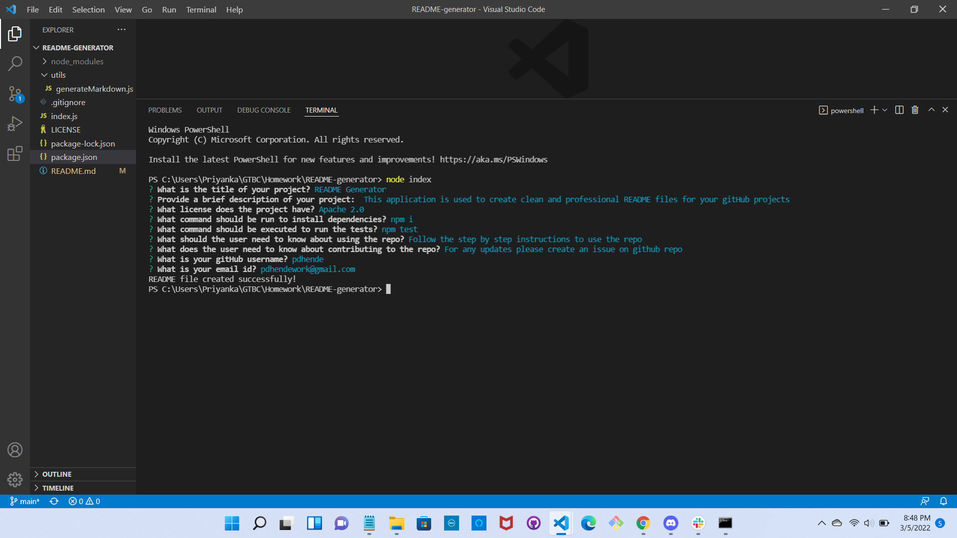 Once all questions are answered a README.md file is generated