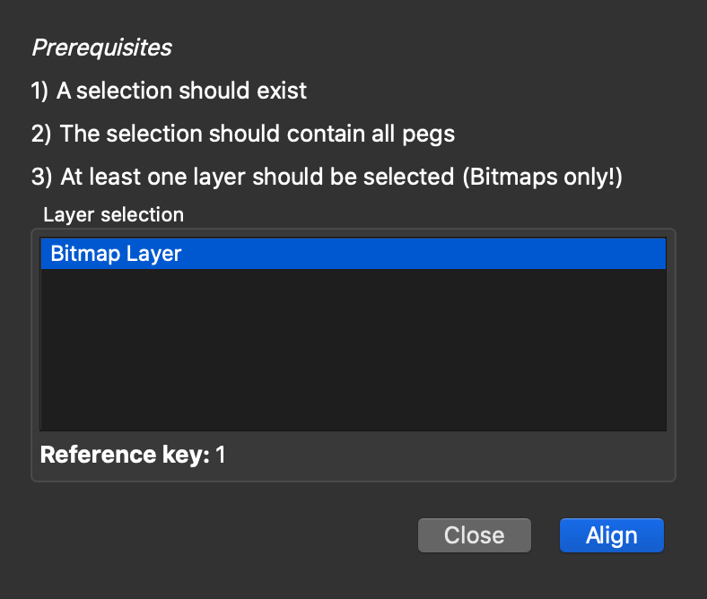- When a selection exists before opening the dialog, it is necessary to deselect, then reselect the layer in order for the align button to become enabled