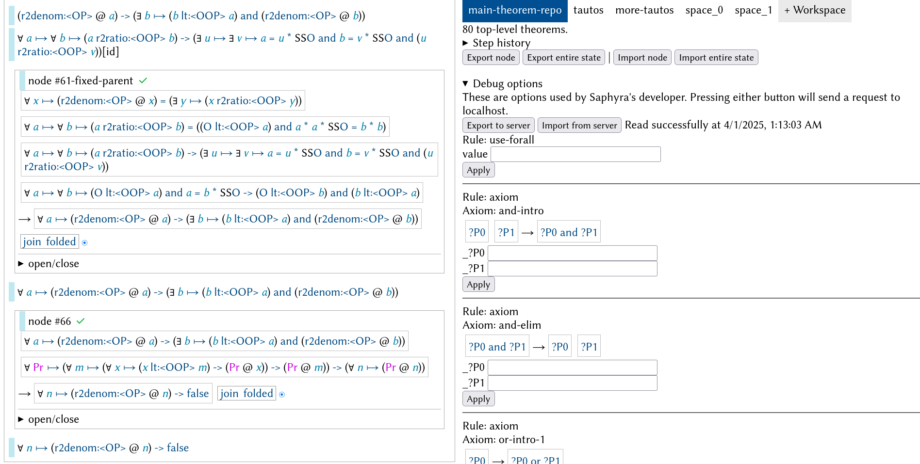 Saphyra uses a Web interface. Using the buttons “Export entire state” and “Import entire state”, one can import a proof repository, work on it, and save it. Clicking on goals (statements not yet proven) will show usable tactics on the right, where the user can provide parameters and apply them.