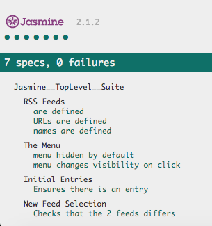 In this project I was given a web-based application that reads RSS feeds. It was down to me to use Jasmine and run tests to ensure the application was running correctly.