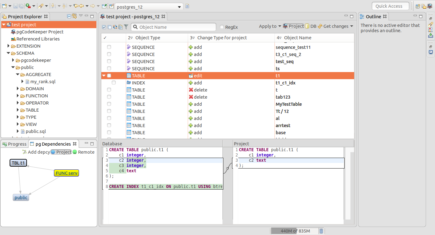 - Generate migration scripts via a user-friendly interface. You can use both live DB instances and DB dumps as initial data. You can also compare pgCodeKeeper projects — useful when working with versions control systems.