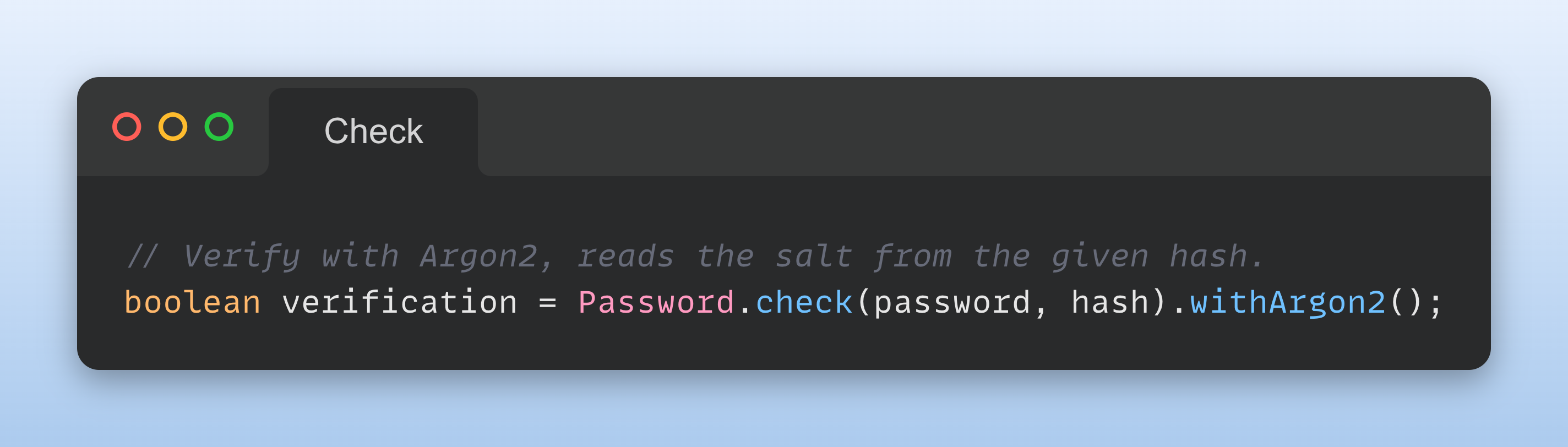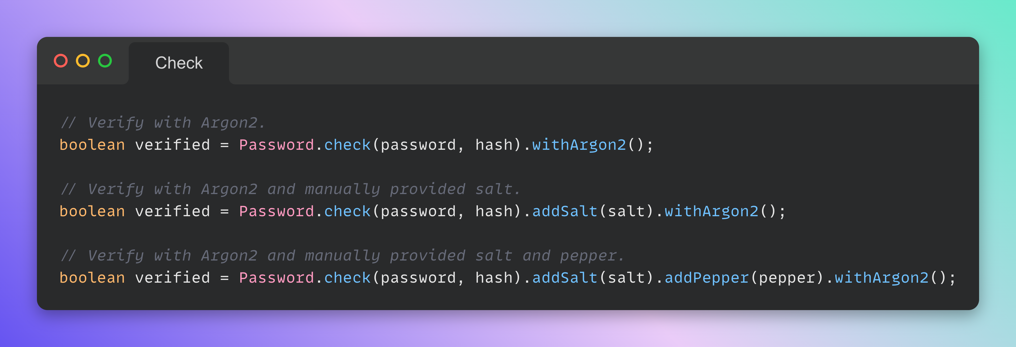 With the same ease you can verify the hash. Salt and pepper may be optionally added to the builder (Argon2 in this case):