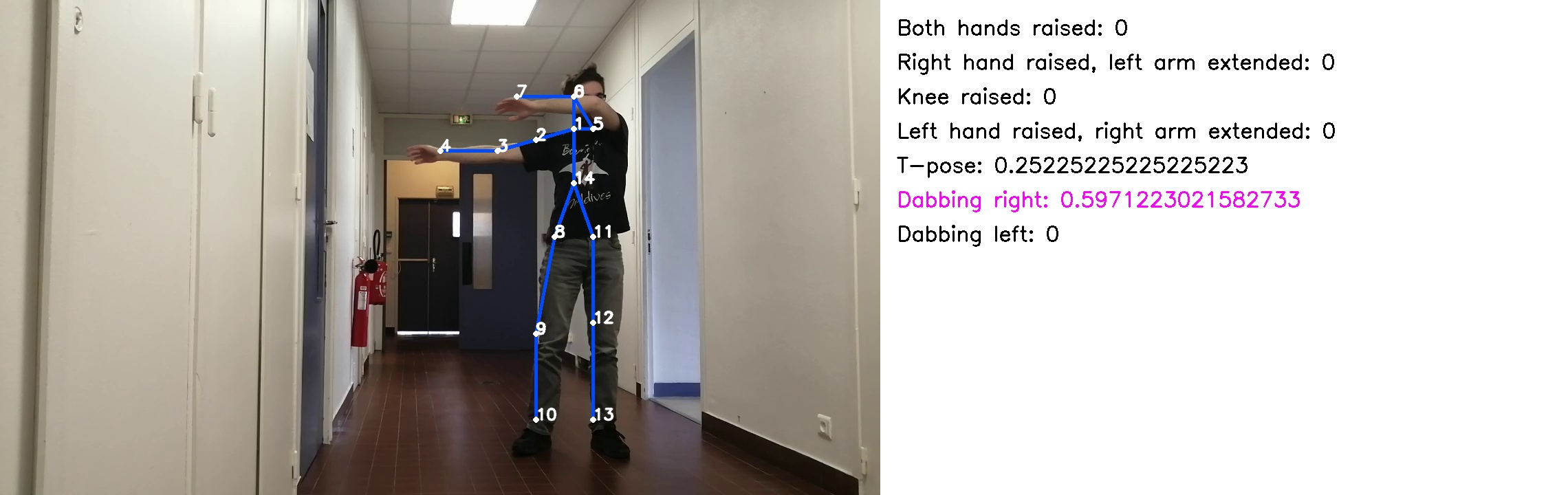 This is an example of a processed image through usage of the library and a MPI neural network, with on the right side a few pose examples and the float result of calling them on the skeleton :