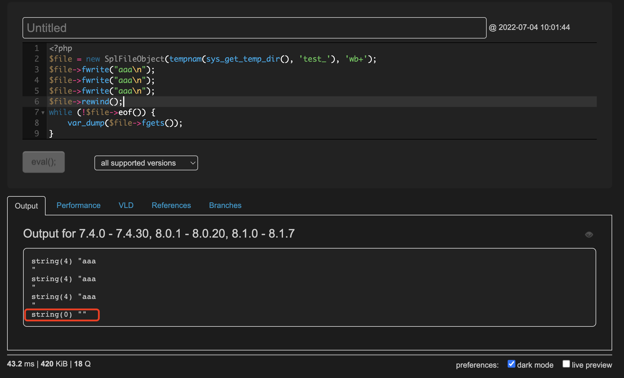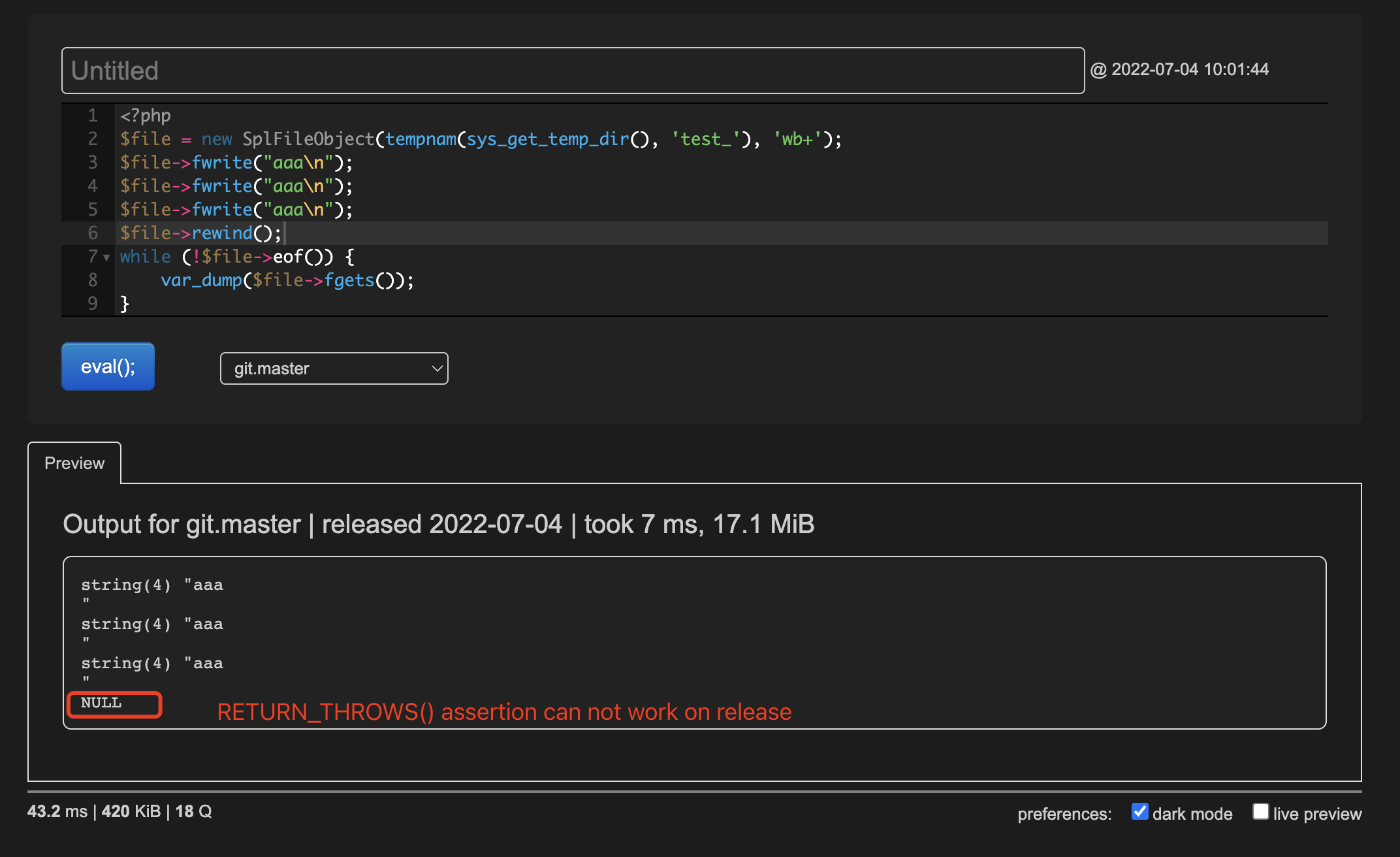 }Before 6f87a5c, it works because the final fgets() will return an empty string instead of returning failure and in the next loop php_stream_eof() returns true.
