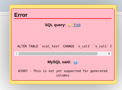 Yes, tested on MySQL. Maria added the virtual columns support sooner and the syntax and features differs. Here is my proposal for MySQL: Currently is GUI at least for me is unsuable as I need to edit the virtual column like the normal columns. The PhpMyAdmin can generate the full ALTER parameters (collation, nullable, etc.) at least for MySQL. I have no experience with Maria DB as I use MySQL only. |