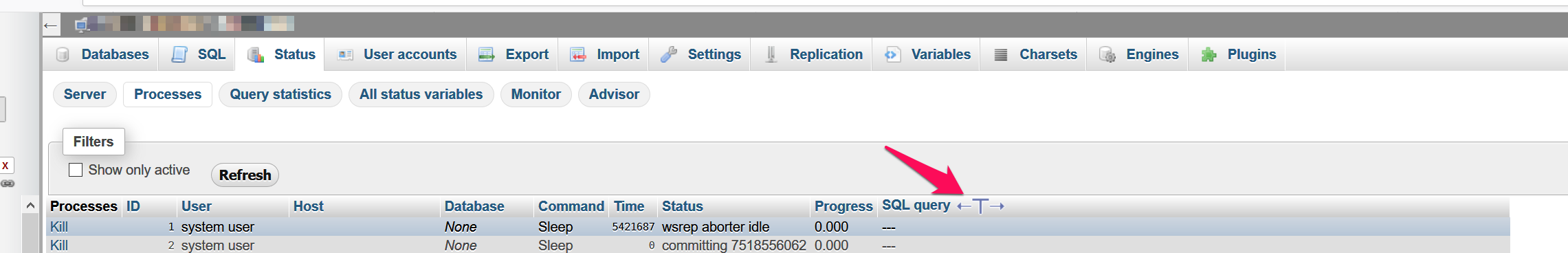 A click on the <-T-> on SQL query in Status -> Processes is without function. It doesn't show the full query.