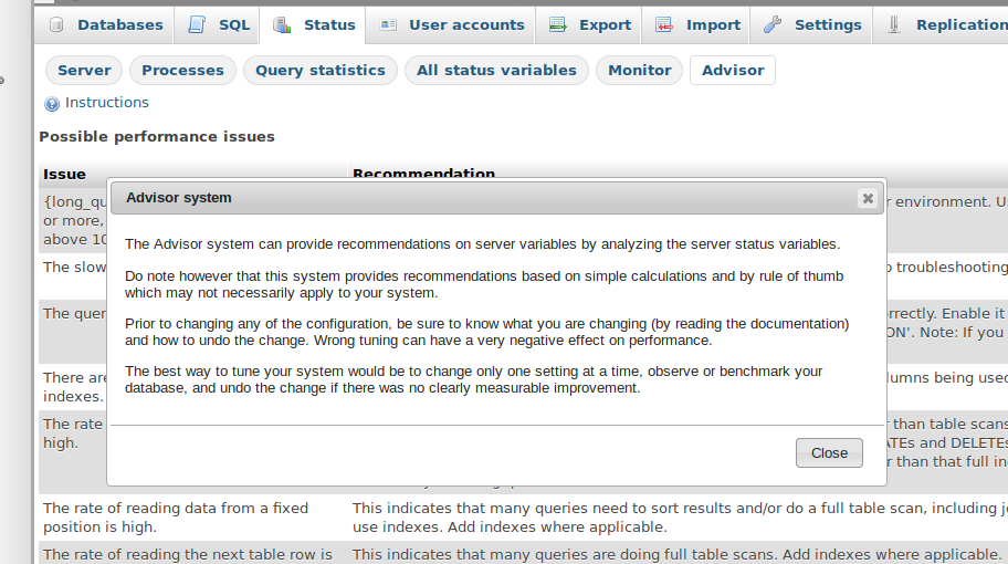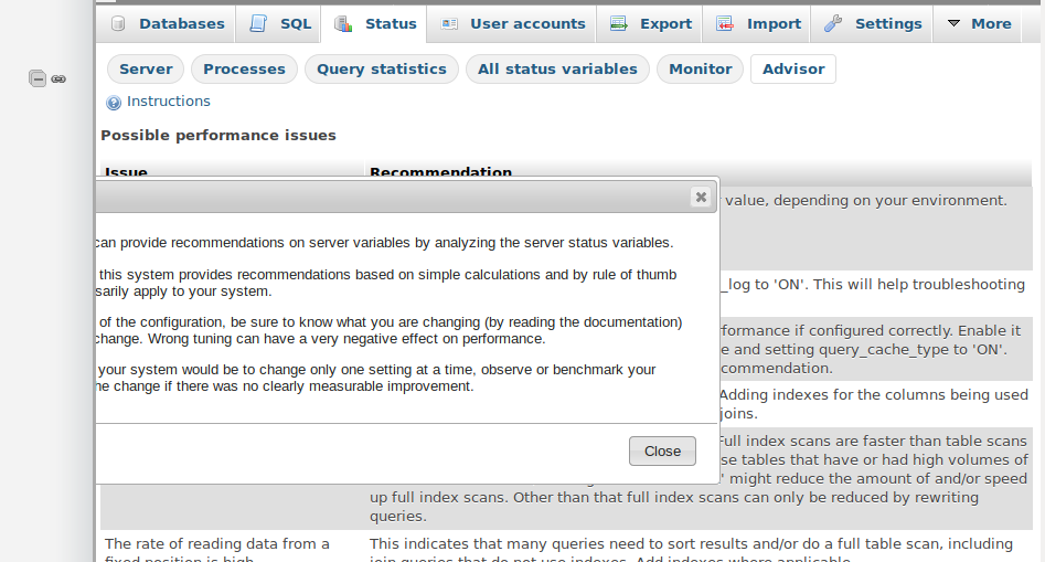Open the instruction dialog box of 'monitor' or 'advisor' tab under status.
