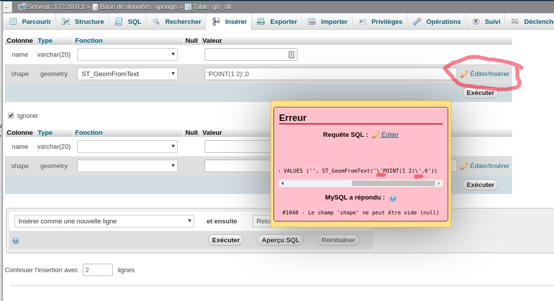which is a valid query and if given 'POINT(1 2)',1, INSERT INTO table_name (id, shape) VALUES (NULL, ST_GeomFromText('\'POINT(1 2)\',0'))