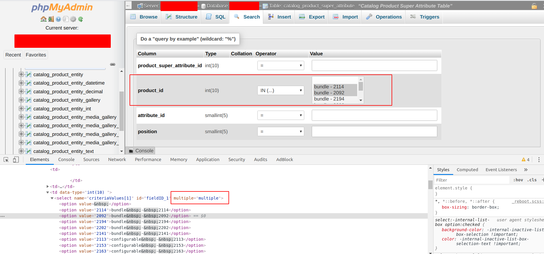 Can't search by the IN condition because of dropdown
