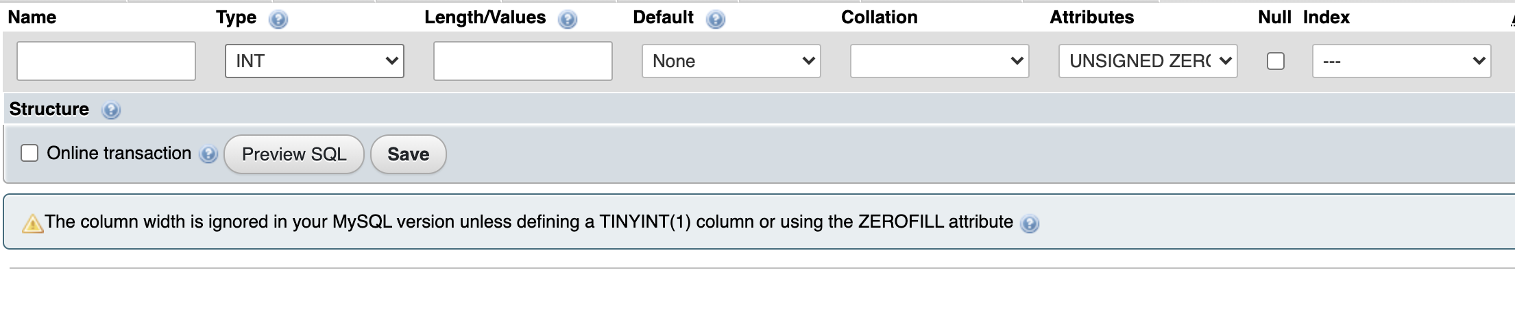 That's a lot to check, so if we reuse the check anywhere it can be turned in to a utility function in libraries/Util.php, but I think it's fine to do the check in the page when we show the create/edit dialog. However, I'm not sure what we need to do right now. Including the length causes MySQL to ignore it, not throw an error, so we're doing okay there. The table structure tab displays correctly because we just show what MySQL tells us about the table. What we might want to do is show a warning message (similar to the warnings we show on the Insert page; I don't recall anything we warn about from the structure page), that warning could just say "The column width is ignored in your MySQL version unless defining a TINYINT(1) column or using the ZEROFILL attribute". I'm not sure if any changes should be made to the linter, that could be discussed further. |