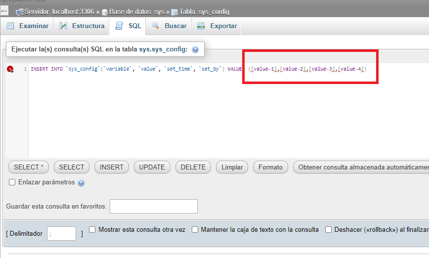 Exmple(IdCMov,columnA) VALUES ([value-1],[value-2]);I hate every time a Query is generated in phpmyadmin it says that it has errors because its example does not comply with the Proper syntax