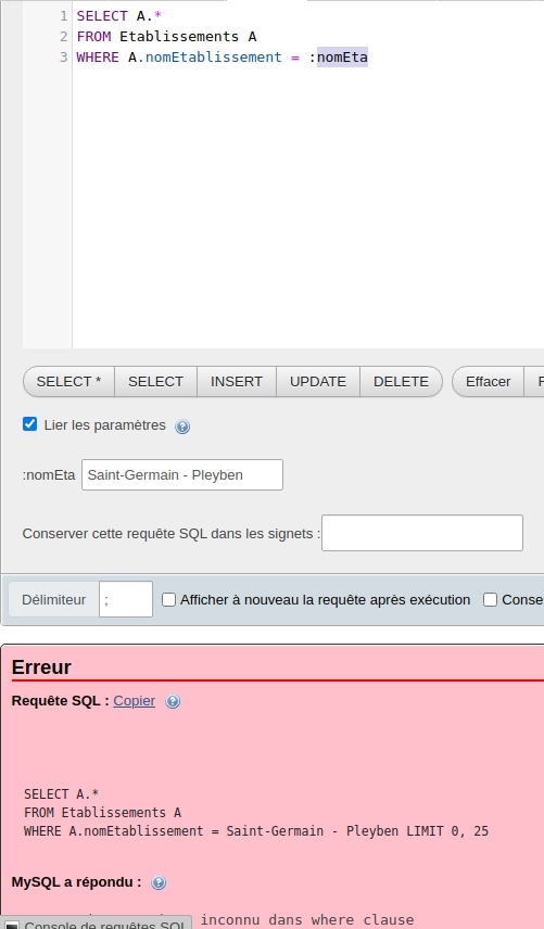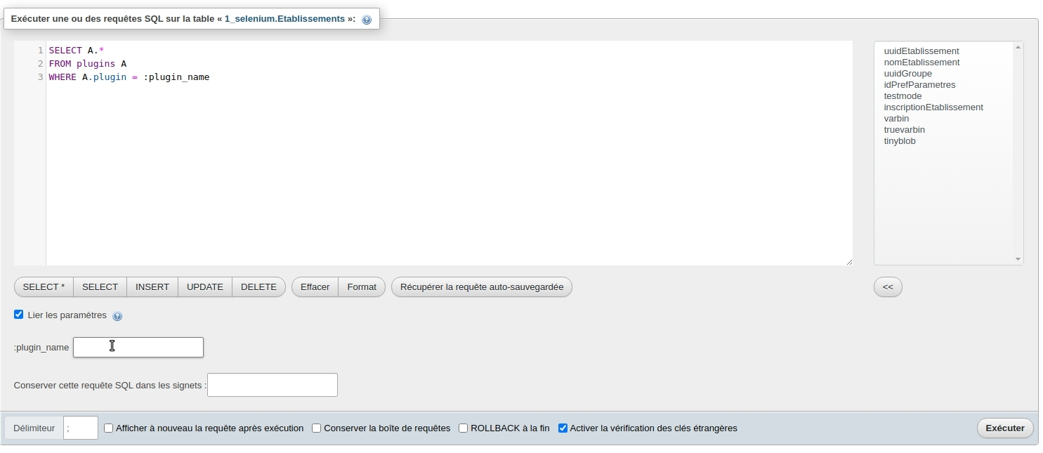 :plugin_nameshould be replaced with'info'and not withinfo.If in the inputfield also quotes are typed, these are escaped correctly. So the local implementation in the phpmyadmin-interface of the bind parameters seems not to recognize strings.
