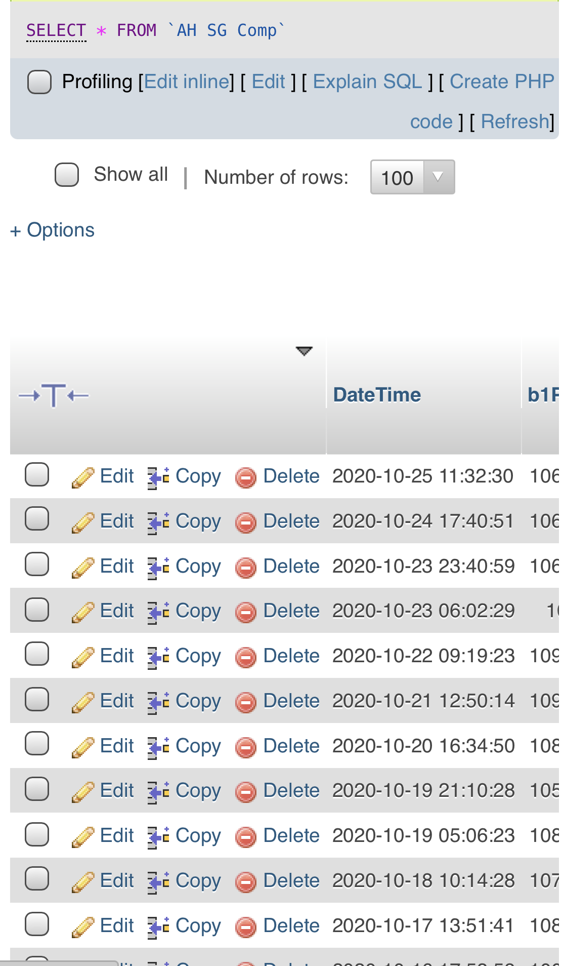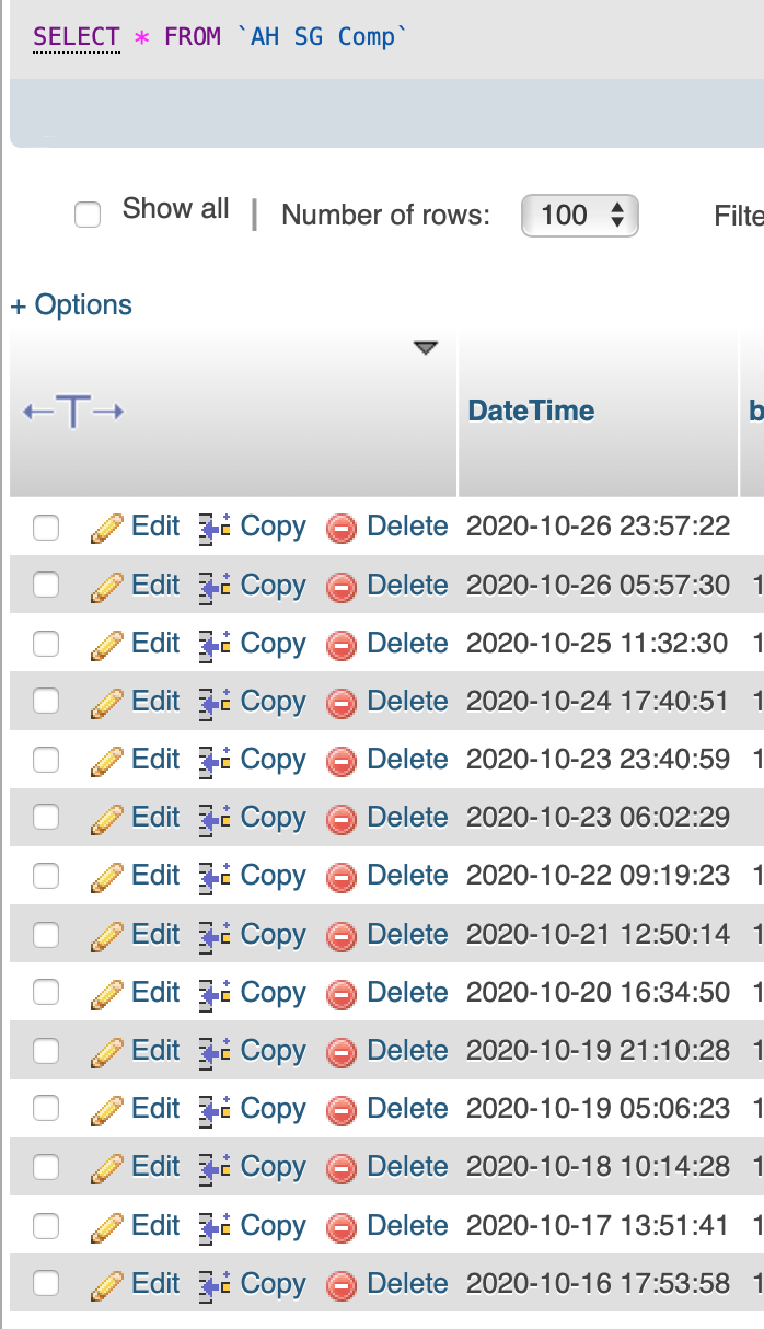 From iOS (both rows from 2020-10-26 blocked from view by the header row, note the additional whitespace between “+ Options” and the header row)