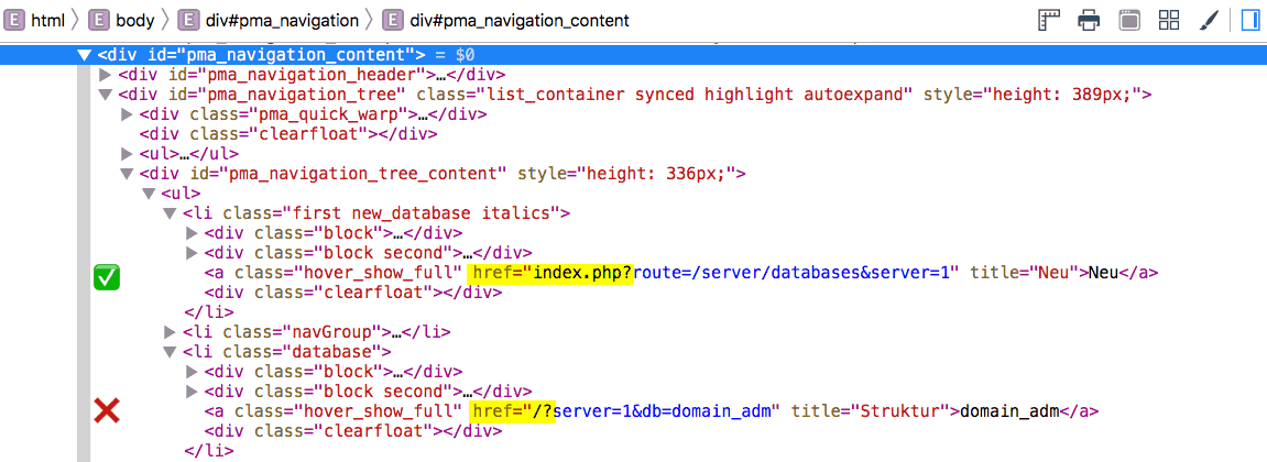 With or without defined PmaAbsoluteUri ($cfg['PmaAbsoluteUri'] = 'https://' . $_SERVER['SERVER_NAME'] . '/mysql_latest/';) I got the wrong navigation links on the left menu (see screenshot of the source code in browser). Only the link to a new database is correct (index.php?...), all other links to existing databases are wrong (/?...) I guess instead of (./?...). Where can I change this strange behavior, i.e. changing [slash] with [dot][slash] in href of the pma_navigation_tree_content?